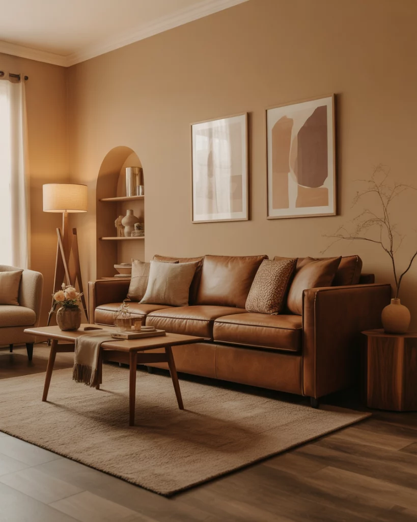 Soft golden beige offers a neutral yet radiant base for living rooms in 2026. Unlike plain off-whites, this shade adds a warm undertone that makes the space feel instantly cozy. It pairs seamlessly with brown furniture and light brown wood floors, making it ideal for transitional or classic homes. It’s a safe choice that still feels stylish.