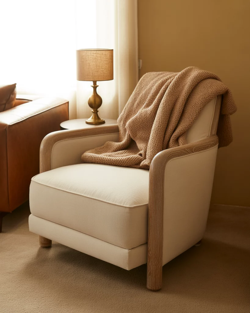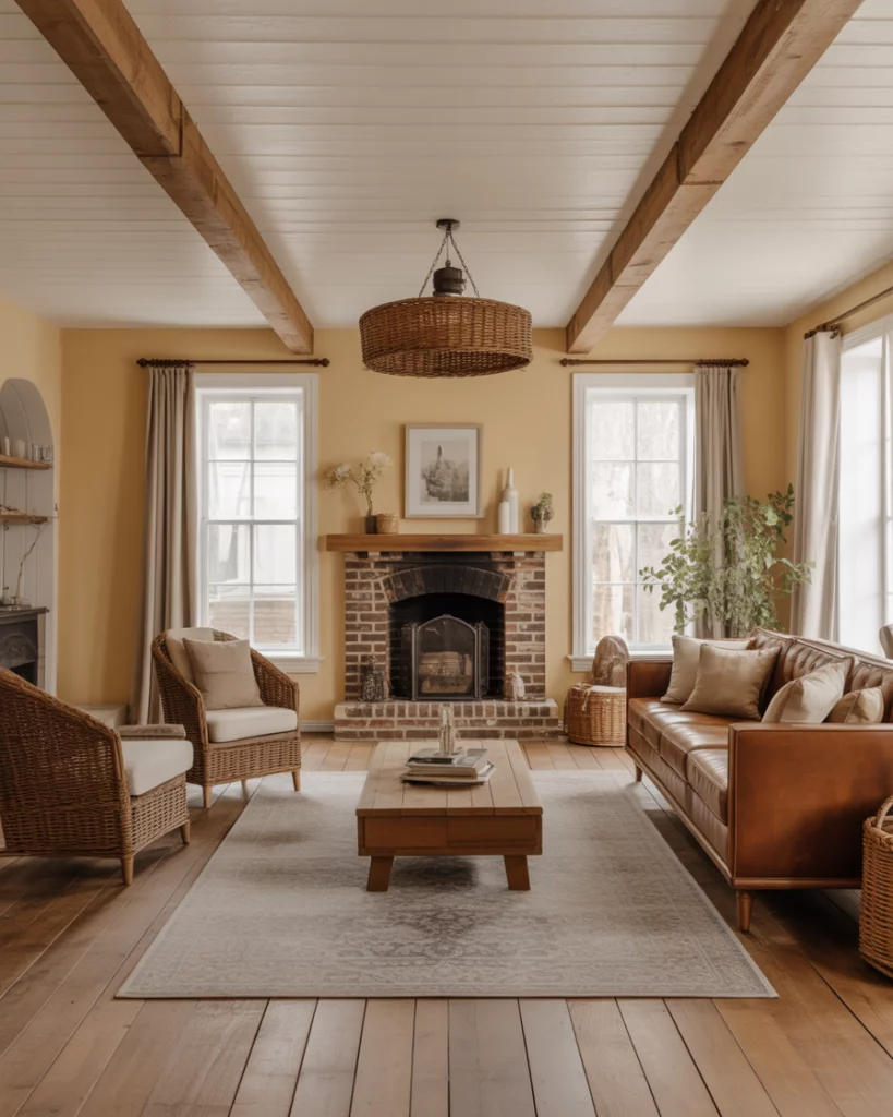 Warm cream walls are an excellent backdrop for rustic living rooms. They highlight the texture of reclaimed wood beams, vintage brown furniture, or brick fireplaces without stealing attention. Adding an accent wall in a slightly deeper cream tone gives subtle depth, while light brown wood floors complete the farmhouse charm.