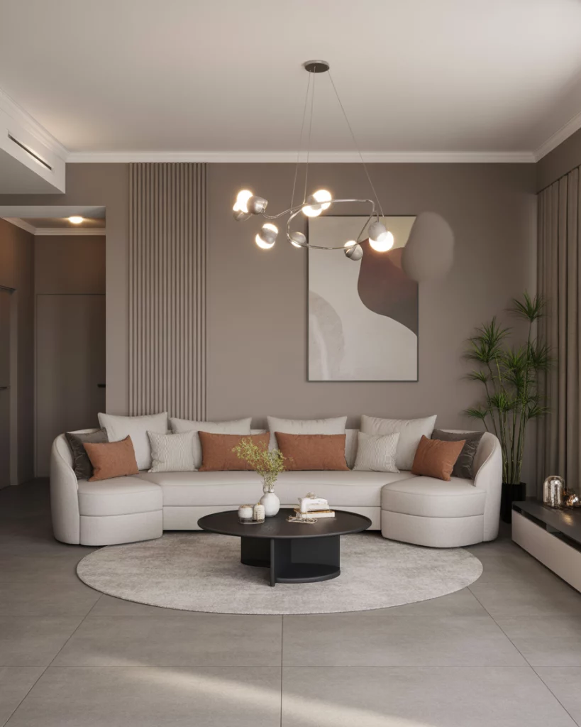 Taupe, sitting between grey and beige, is becoming a neutral of choice for modern living rooms. This shade looks polished when paired with a grey accent wall gray flooring combination, offering understated elegance. Perfect for large or open-plan layouts, taupe adapts well whether you’re going minimalist or layering textures.