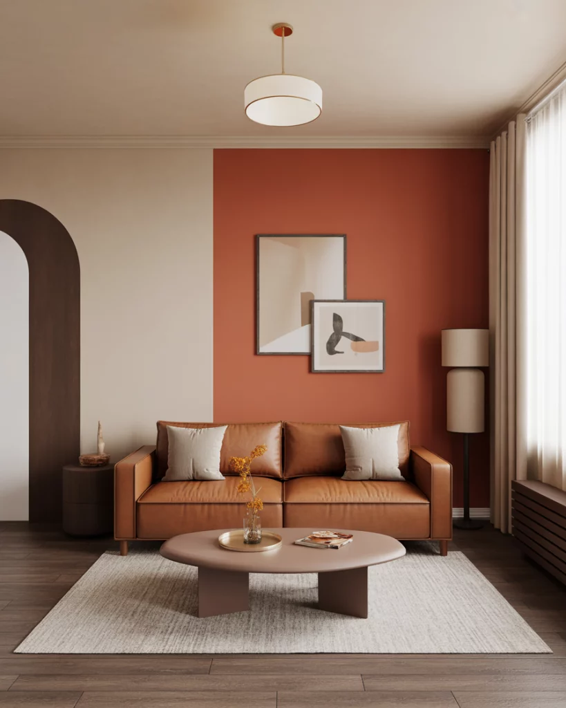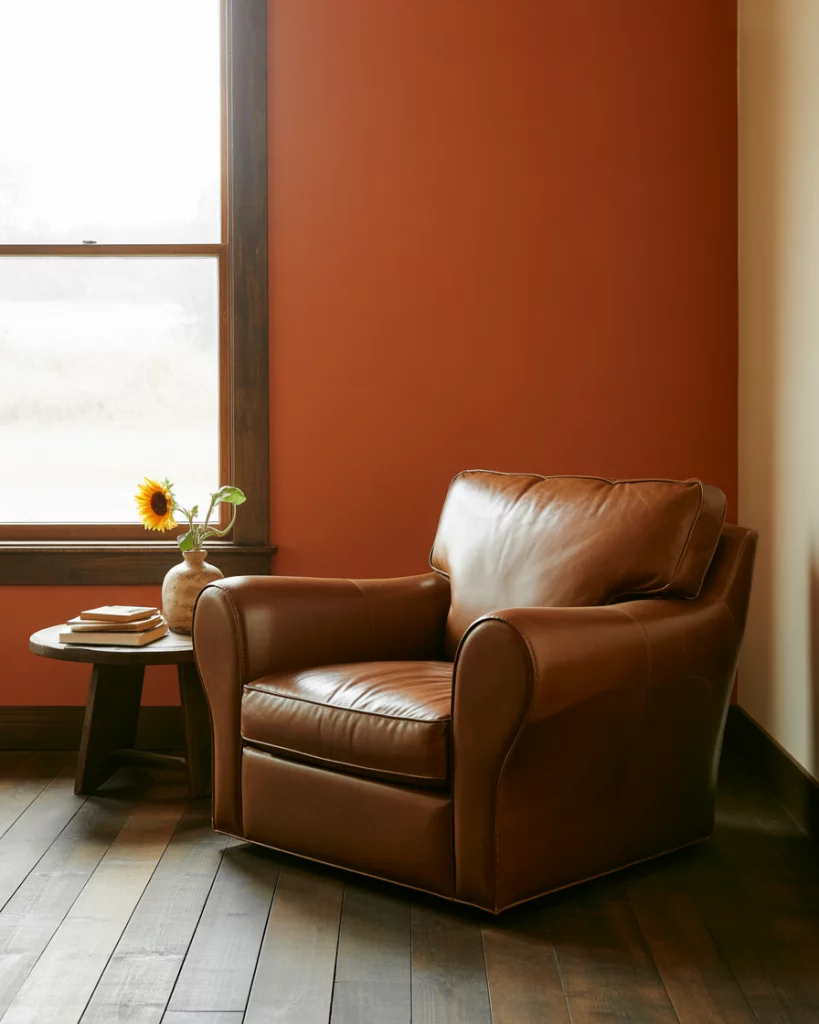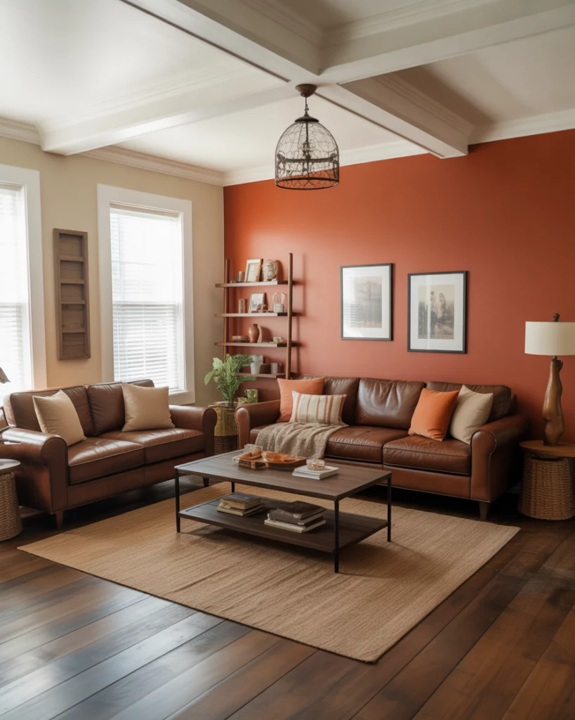 The modern farmhouse look is here to stay, and 2026 will see it evolve with warm oranges and sun-baked terracottas. A subtle accent wall in these hues paired with dark wood floor or brown furniture makes the space feel relaxed yet polished. Behr is leading this trend with earthy-inspired collections.