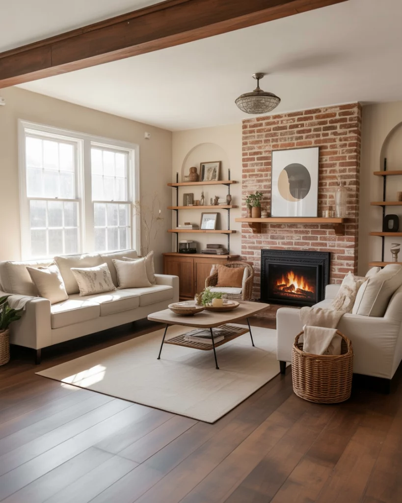 Soft earthy shades will dominate 2026 living rooms. Think neutral beiges, sandy taupes, and light brown wood floors that provide a calming backdrop. These tones work especially well for a farmhouse feel or with rustic details like a red brick fireplace. They’re versatile enough to highlight an accent wall while still feeling timeless and grounded.