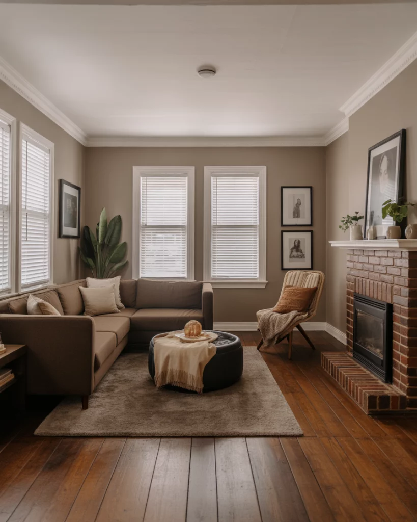 “Greige,” the mix of grey and beige, continues to be a designer favorite in 2026. This neutral tone adapts to nearly any design style—whether farmhouse, modern rustic, or transitional. It pairs beautifully with dark wood floor, brown furniture, or even a red brick fireplace, making it endlessly versatile for American homes.
