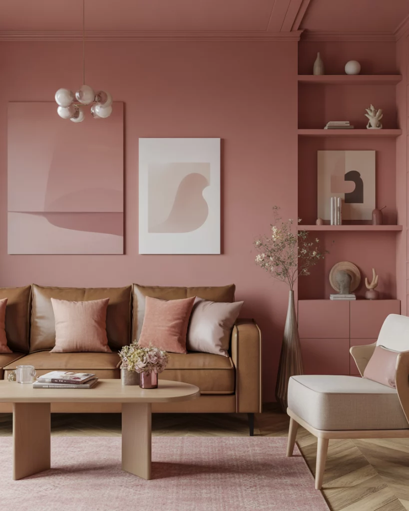 A soft dusty rose adds a gentle touch of warm elegance to the living room. Unlike bold pinks, this muted tone feels sophisticated and pairs beautifully with neutral furnishings or brown furniture. It works well in small spaces cozy layouts, giving just enough personality without overwhelming. Designers at Behr have highlighted blush tones as modern yet timeless accents for 2026.