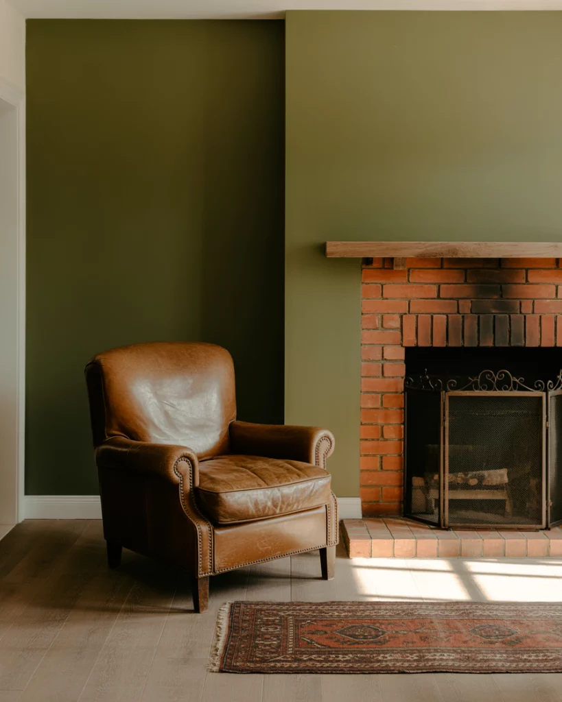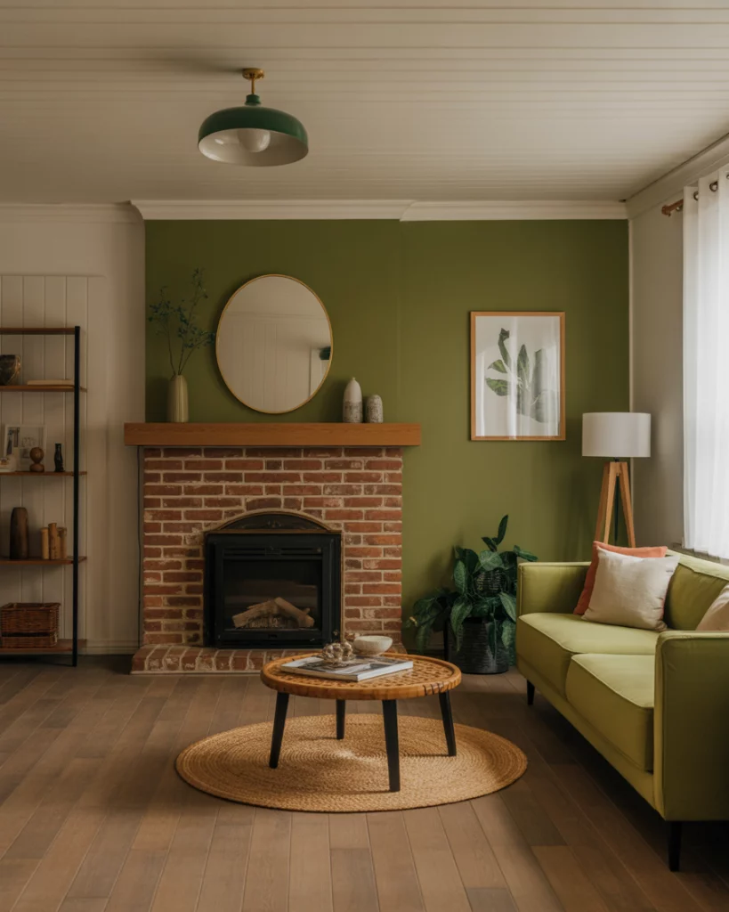 Olive is an earthy tone that bridges modern minimalism and rustic charm. On an accent wall, it creates depth while still feeling natural and grounded. Pairing olive with light brown wood floors and a red brick fireplace captures the balance between coziness and sophistication. This is a color choice that resonates with farmhouse and urban styles alike.