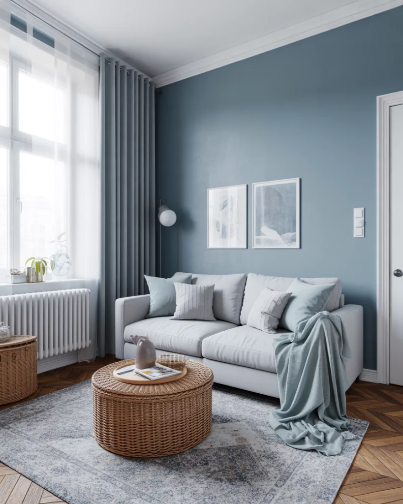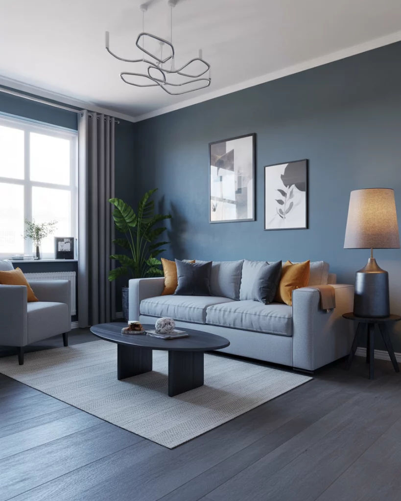 For a refreshing twist, slate blue pairs effortlessly with grey details. Think grey accent wall gray flooring offset by a slate blue accent wall for balance. This combination feels clean and bright while maintaining a cozy atmosphere. It’s especially effective in modern homes where layering cool tones makes the space elegant yet approachable.