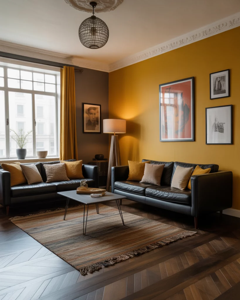 Mustard yellow makes a bold yet cozy choice for 2026. On a tv wall or behind shelving, it brings personality while pairing seamlessly with dark furniture sofas and neutral rugs. This shade also complements brown furniture and dark wood floor, making it an excellent choice for eclectic or vintage-inspired living rooms.