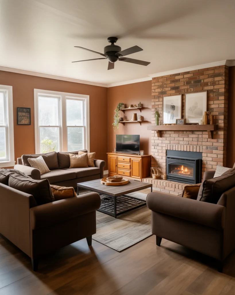 Incorporating rustic palettes creates warmth and charm, especially with brown furniture against textured walls. Pairing an accent wall brick fireplaces idea with earthy browns and a tv wall setup creates a timeless lodge-like atmosphere. Add dark furniture sofas and sherwin warm tones to complete the rustic elegance.
