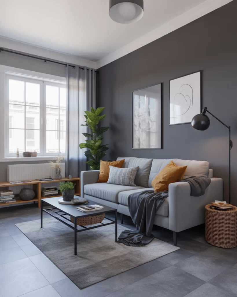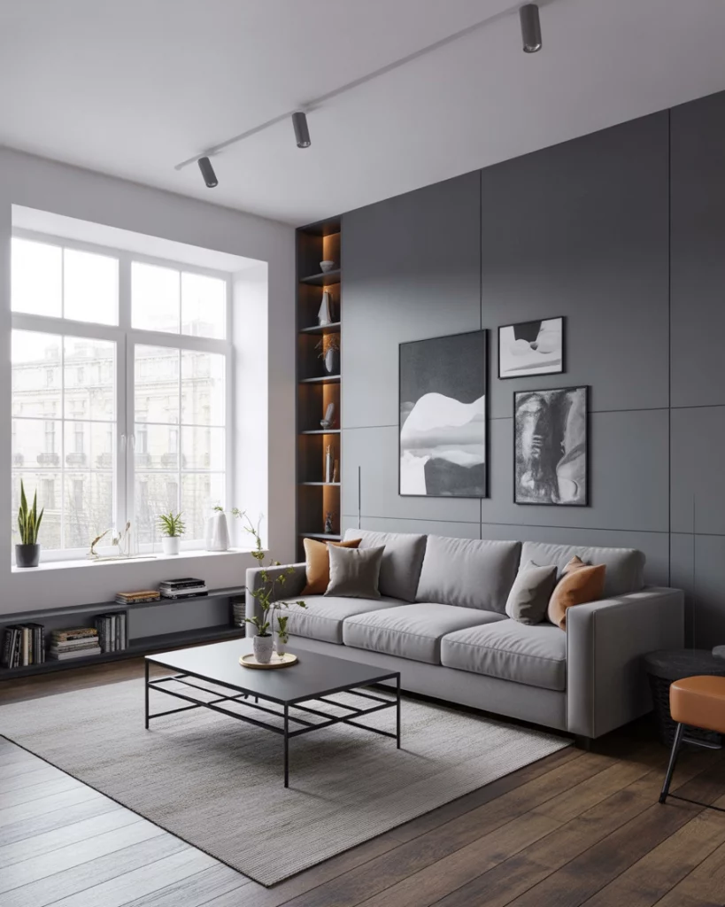 For those who crave boldness, grey in its darkest form—charcoal—brings dramatic flair. A charcoal accent wall behind a tv wall or bookshelf can add depth, especially when balanced with bright white trim and metallic fixtures. This style suits large living rooms, making them feel more intimate without overwhelming the space. Pair with brown furniture for a grounded finish.