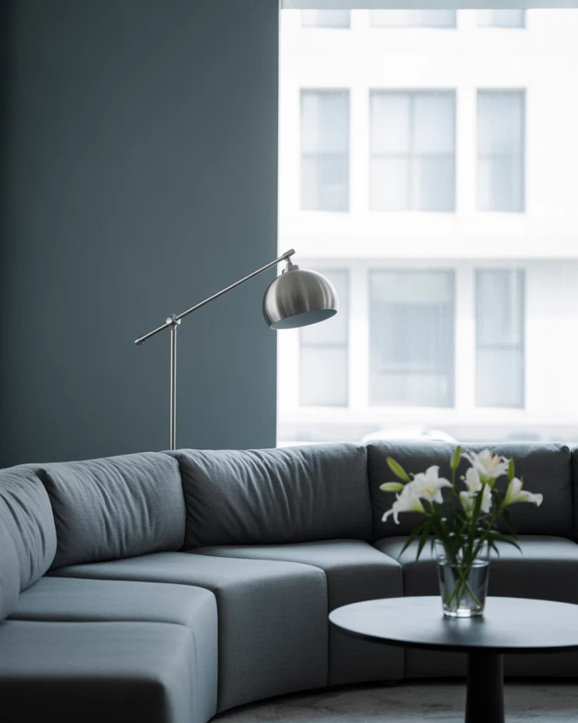 The pairing of a grey accent wall gray couch feels ultra-modern and chic. By layering different shades of grey, you create subtle depth without overwhelming the eye. This look pairs well with metal accents, glass coffee tables, and large windows for a sleek yet inviting aesthetic. Sherwin’s 2026 palettes are leaning into these tonal greys for urban homes.