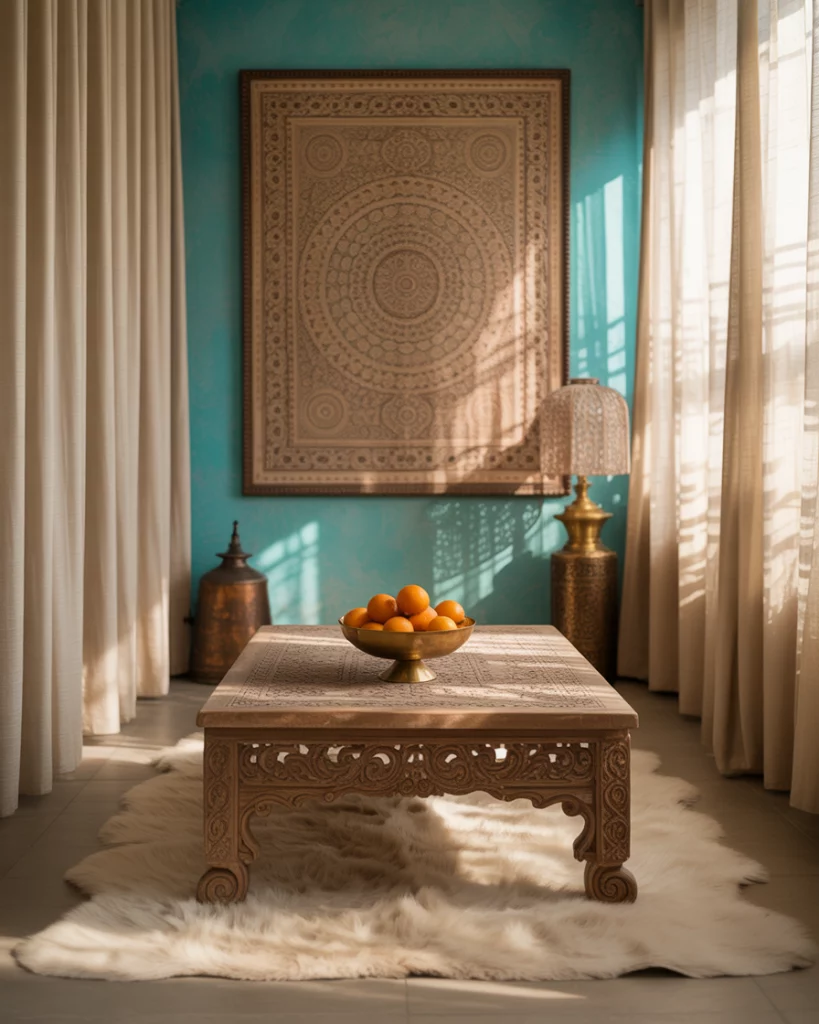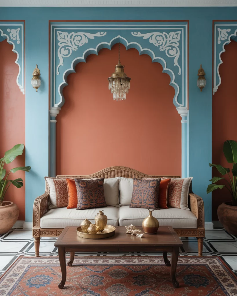 Drawing inspiration from Indian Asian paints bedroom palettes, vibrant tones like saffron orange or deep blue bring cultural richness into a living room. Combined with neutral walls and light trims, these hues transform a simple accent wall into a storytelling element. It’s a great way to celebrate Indian heritage while keeping the room stylish.
