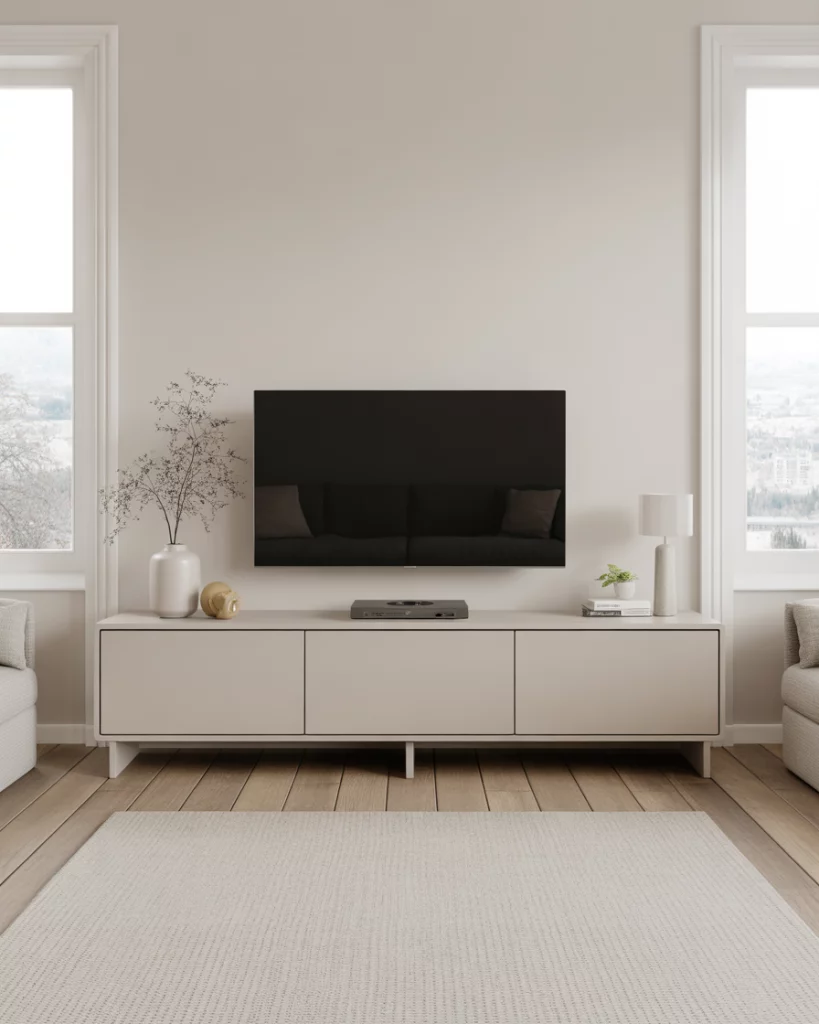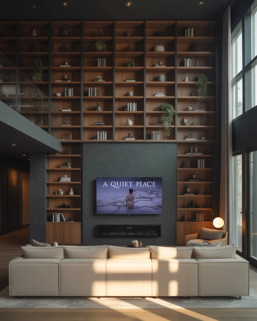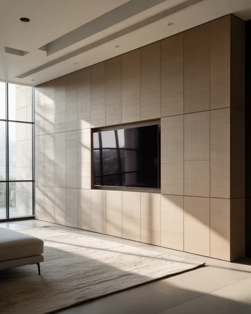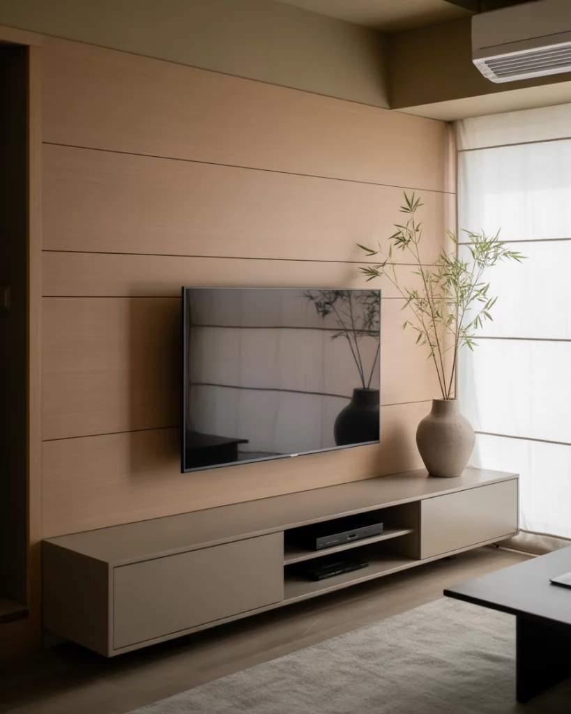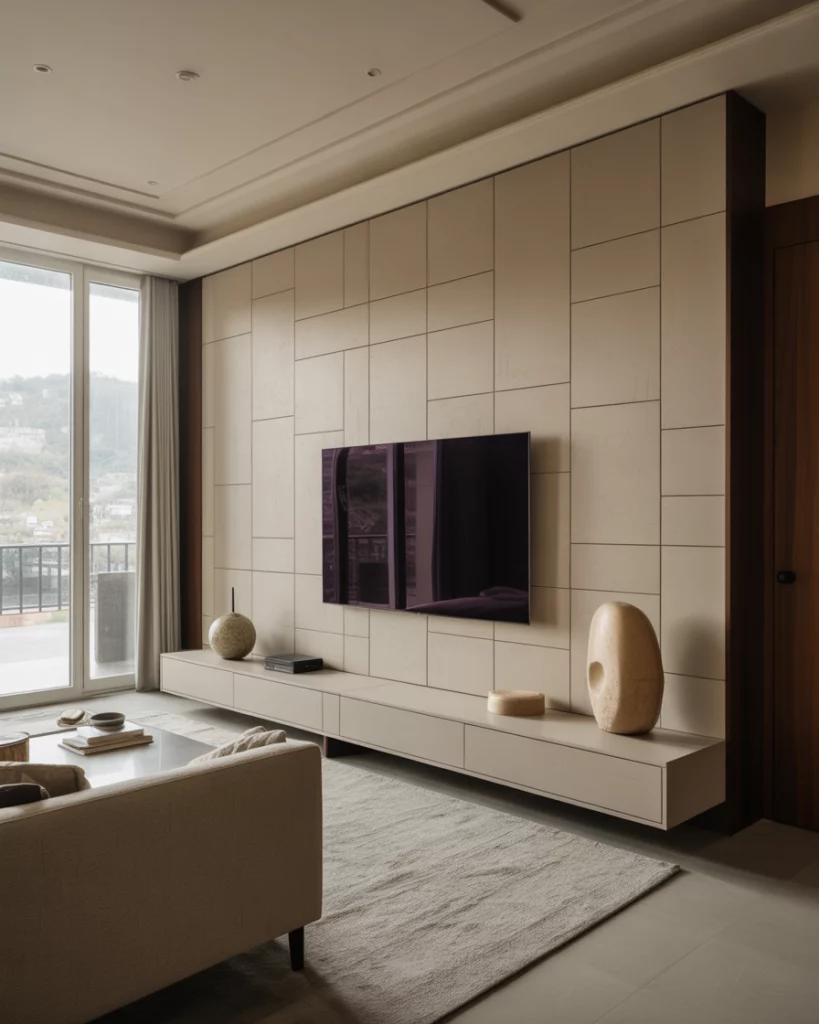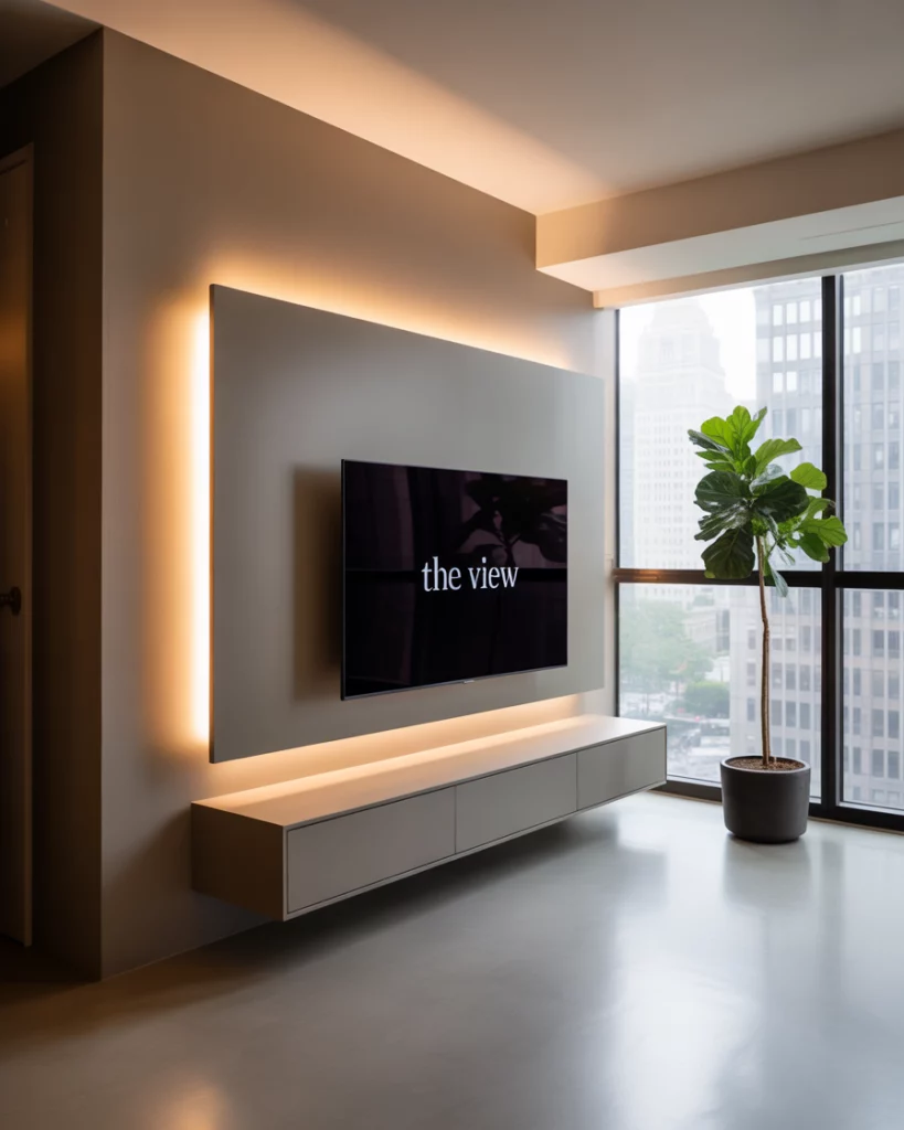 Minimalists will love the modern simple luxury trend of hiding wires, speakers, and consoles behind paneling. This type of mount tv interior design works best in apartment with windows, where natural light highlights the clean lines. Often, the wall doubles as a decorative feature with textured panels or backlighting, showing how modern simple details can make a big impact without excess.
