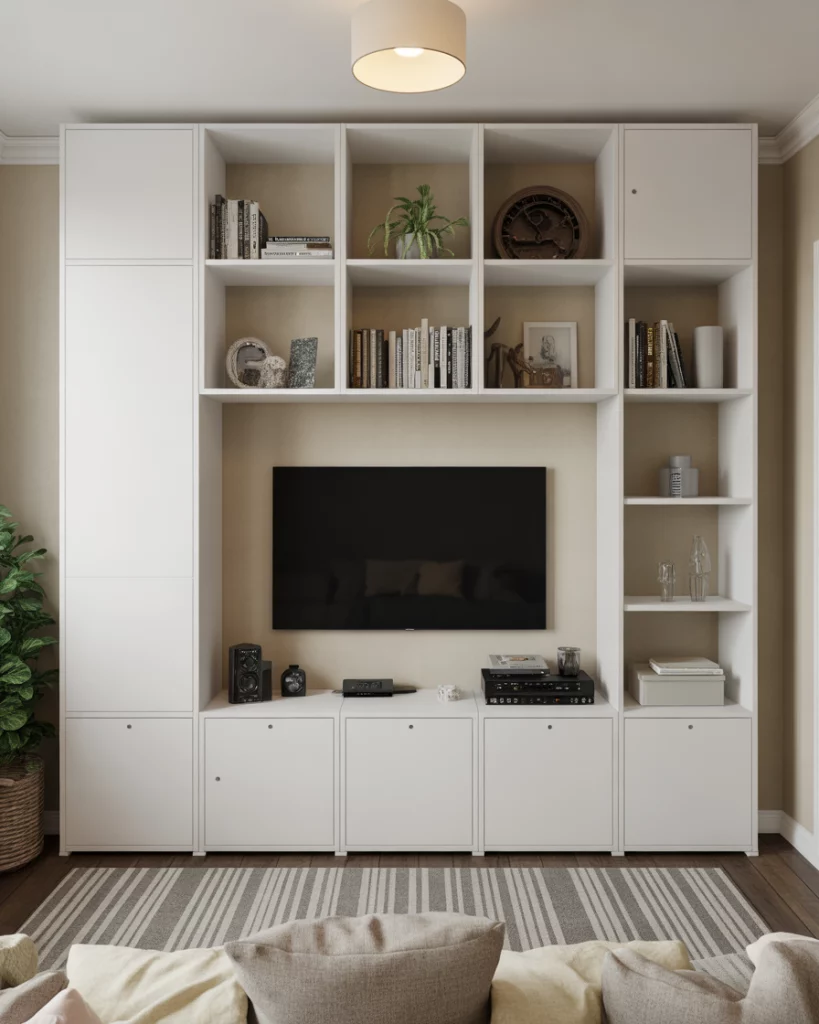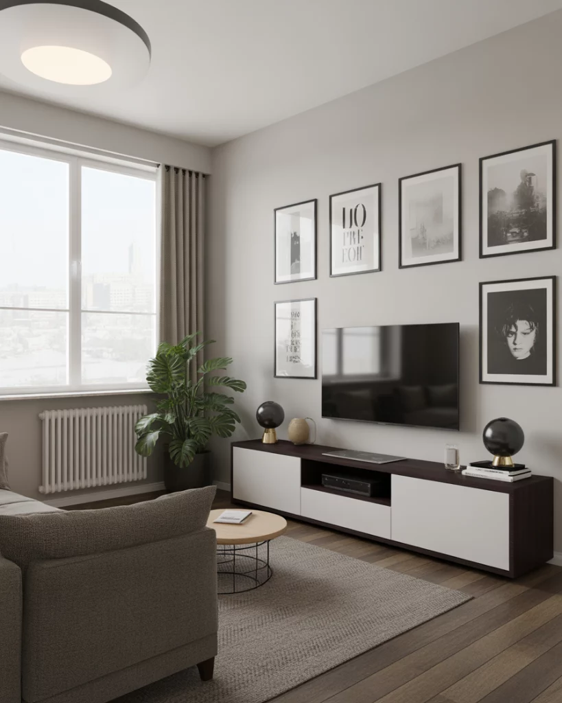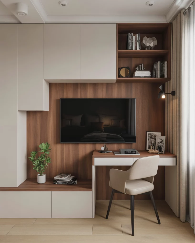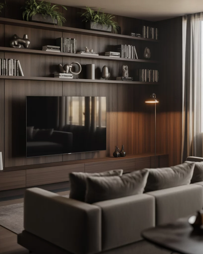 For those who prefer minimalism, hidden sliding panels allow you to cover the TV when not in use. In modern simple luxury interiors, panels may feature wood, fabric, or even art that moves aside when it’s time for a movie. This approach is ideal for small apartments interior design, where maintaining visual simplicity makes the room feel more spacious. Elegant yet functional.