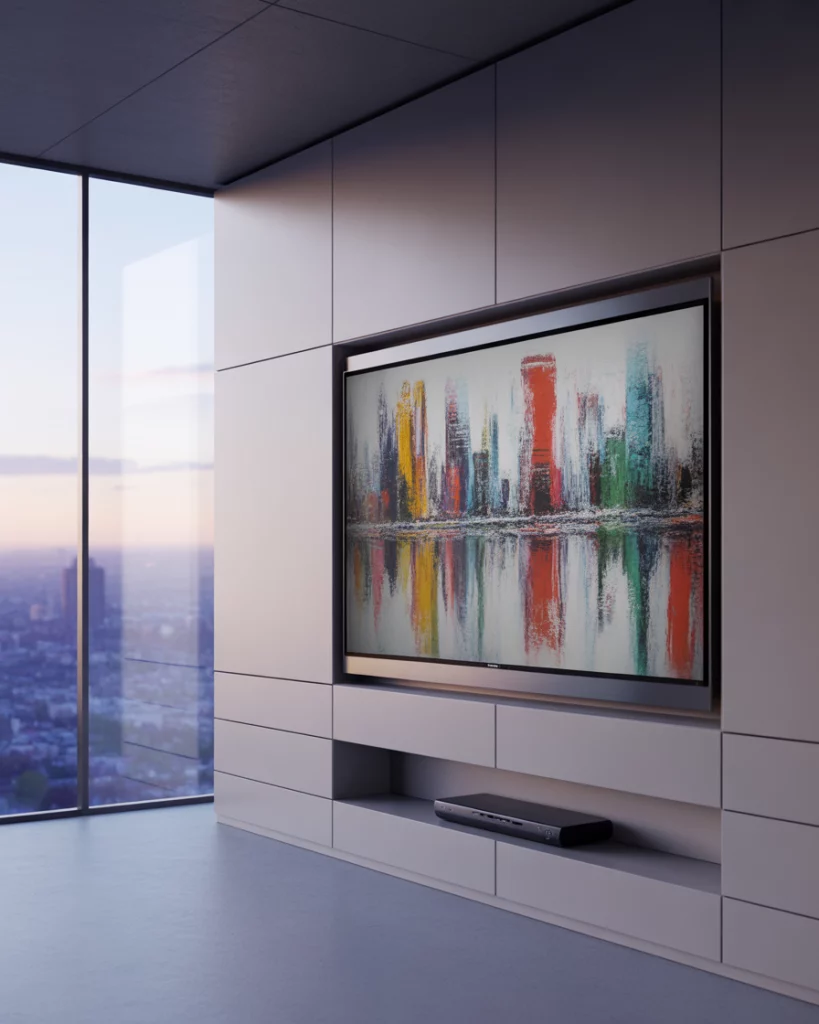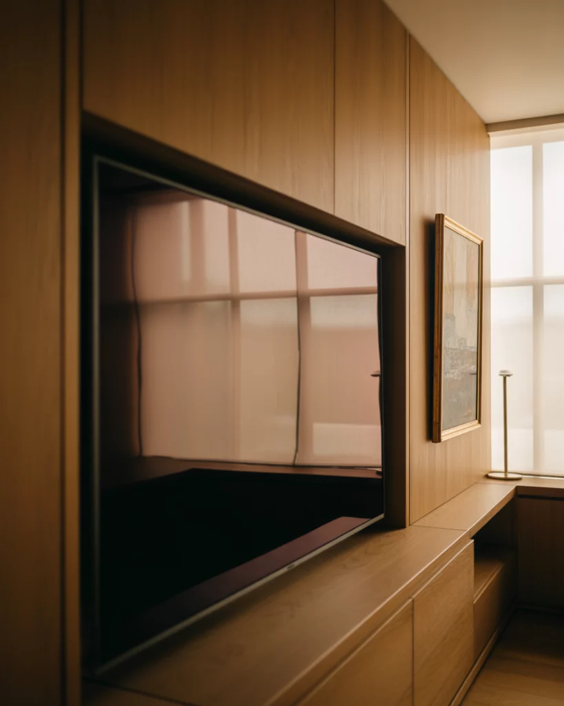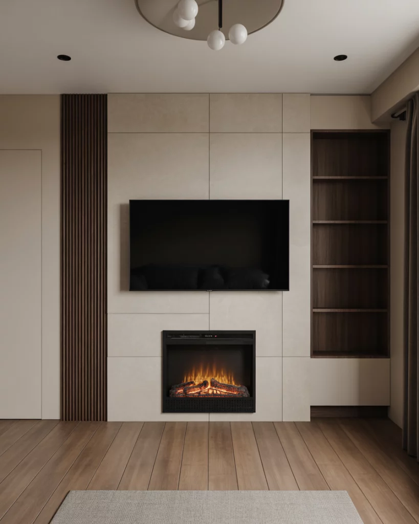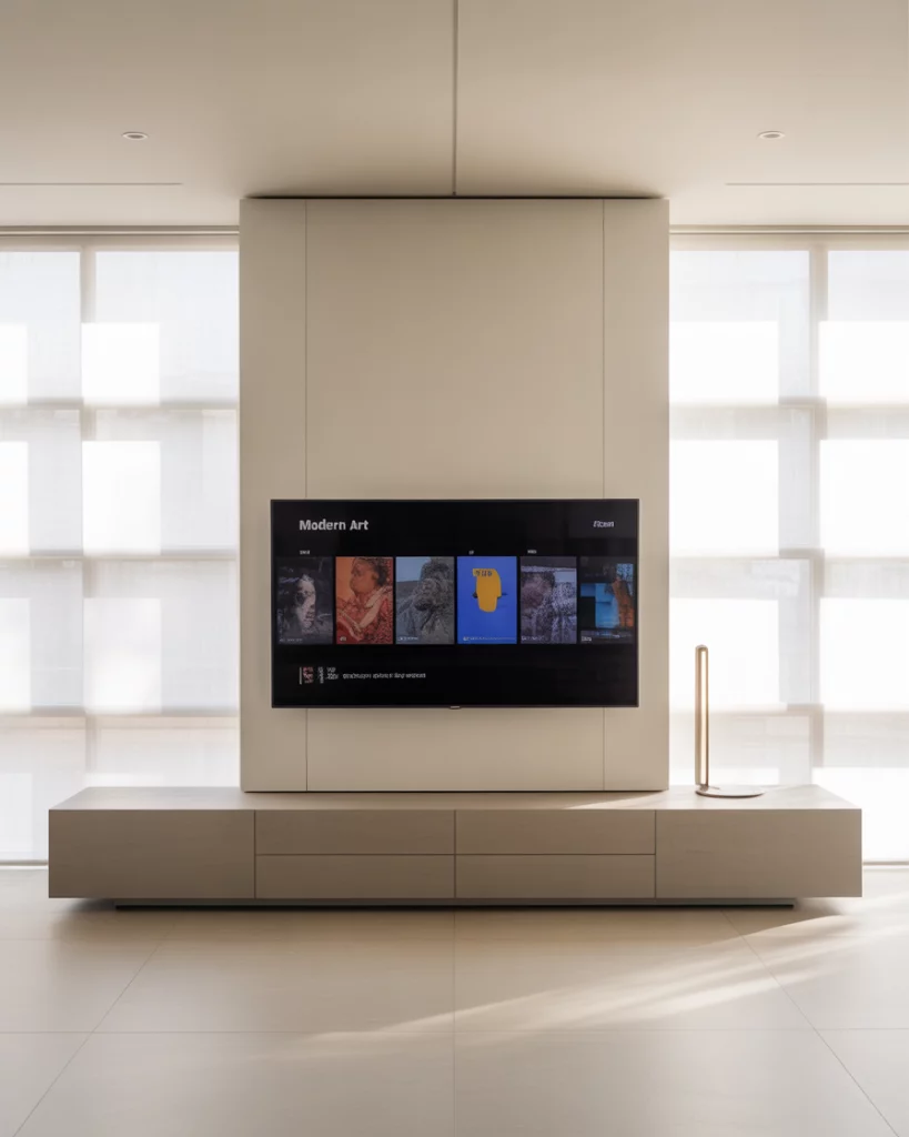 For those who prefer minimalism, hidden sliding panels allow you to cover the TV when not in use. In modern simple luxury interiors, panels may feature wood, fabric, or even art that moves aside when it’s time for a movie. This approach is ideal for small apartments interior design, where maintaining visual simplicity makes the room feel more spacious. Elegant yet functional.