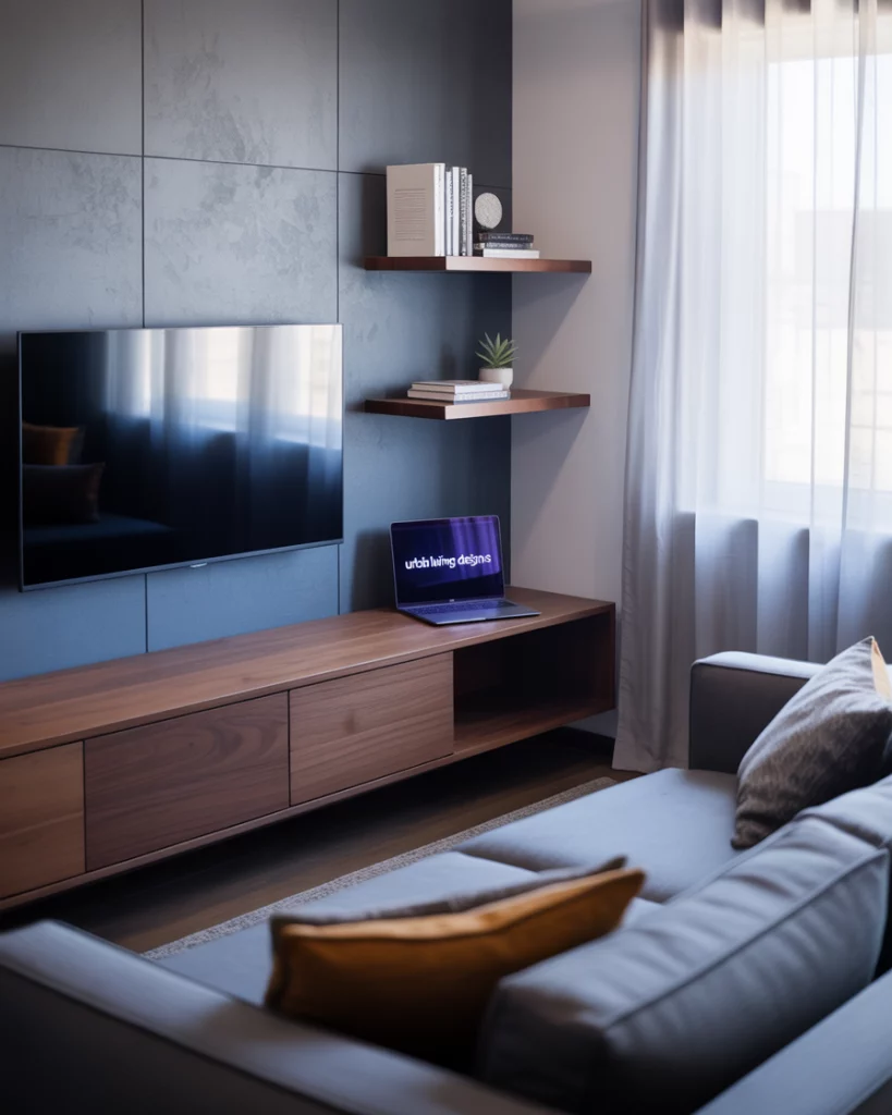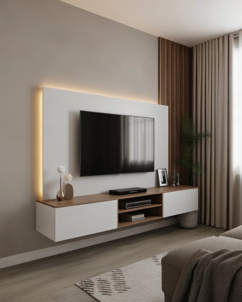 A floating TV wall is a modern simple solution that makes any room feel lighter and less cluttered. By mounting both the TV and a mount tv media console directly on the wall, you free up floor space, which is ideal for small apartments interior design. The floating effect pairs beautifully with LED backlighting, adding a touch of modern luxury without overwhelming the room. It’s sleek, stylish, and practical for open layouts.