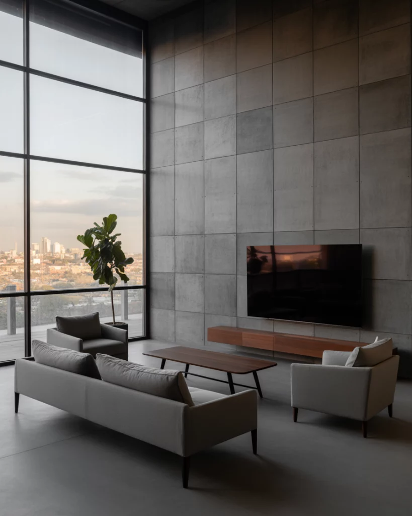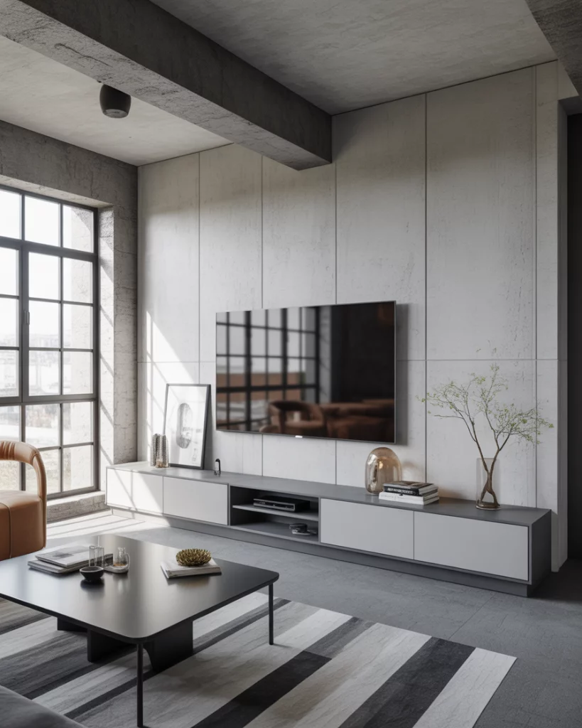 Raw concrete panels are becoming a go-to feature for those who want a modern yet edgy living room TV wall. This style works perfectly in lofts, urban apartments, or spaces with an industrial vibe. Combined with modern simple luxury furniture and minimal accessories, concrete adds drama without needing color. If your apartment with windows gets great natural light, concrete walls balance brightness with grounded strength.
