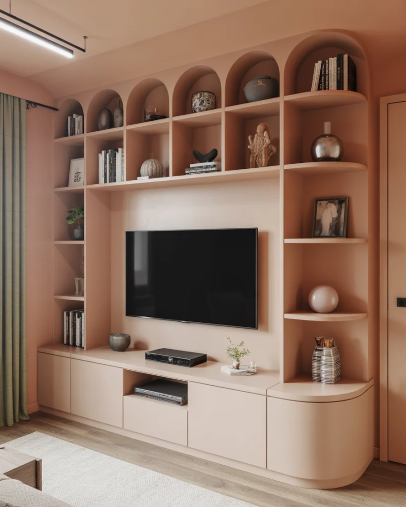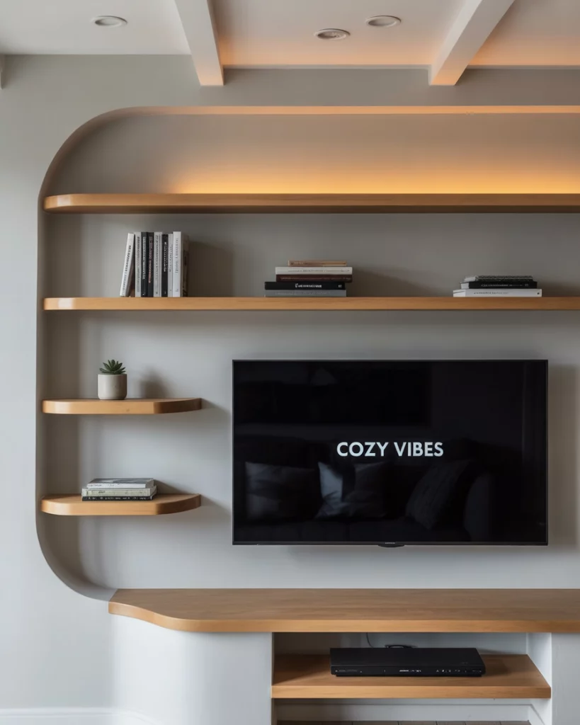 Curves are trending in 2026, softening the sharp lines of modern simple interiors. A curved TV wall with rounded shelving or an arched backdrop gives your space a futuristic yet cozy feeling. This works especially well in small apartments home decor, where soft lines help visually expand a small space. Pair with warm tones or wood to balance the modern tech look with comfort.
