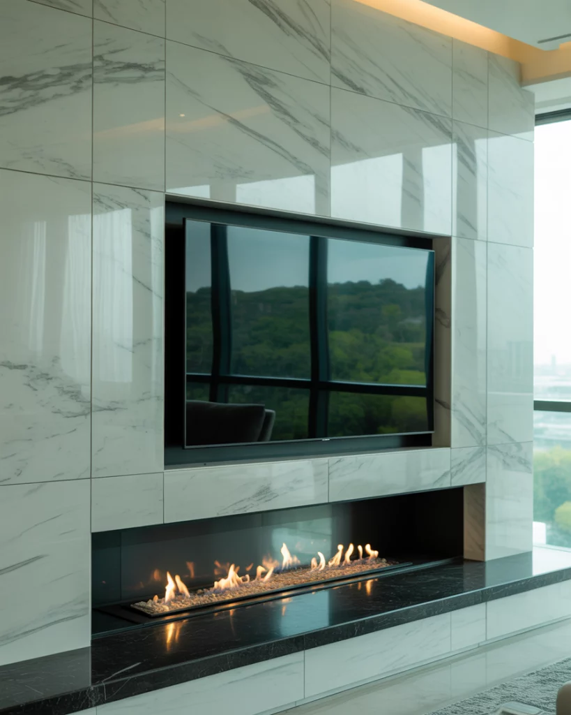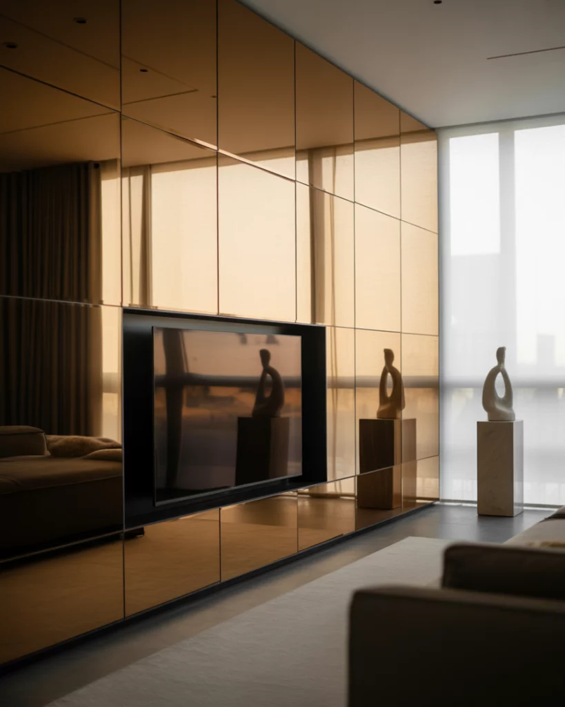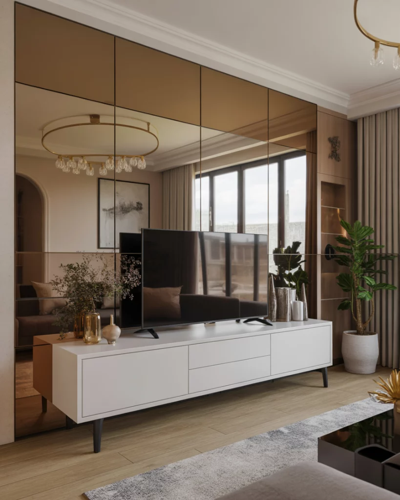 For a bold modern luxury approach, reflective surfaces like glass or mirrors can turn your TV wall into a statement. This design amplifies light from windows, making small space living rooms feel more expansive. A mirrored TV backdrop also blends the screen into the wall when turned off—an elegant solution for those who dislike tech dominating the room. Works best in contemporary apartment with fireplace layouts.