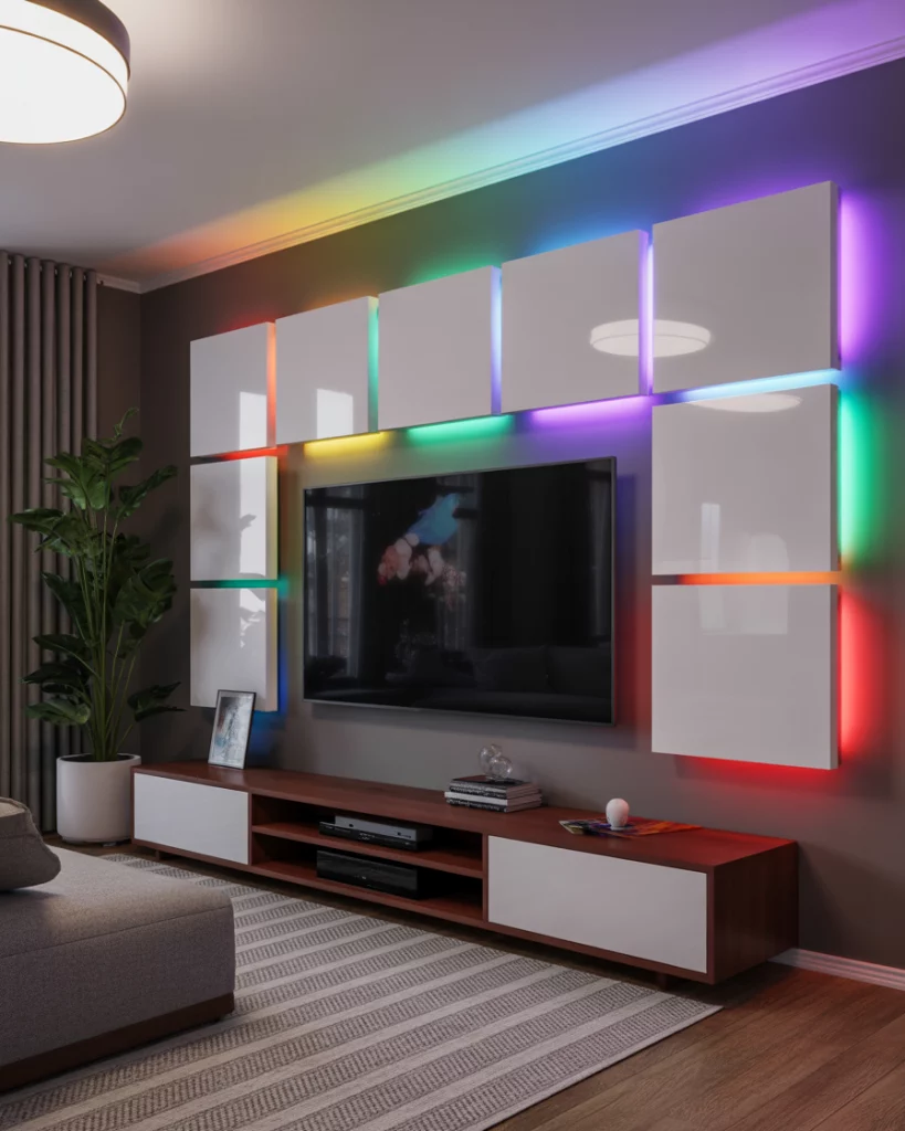 A TV wall with smart LED panels is ideal for tech enthusiasts who love mood lighting. Integrated strips allow you to shift colors based on music, movies, or ambiance. It’s a diy-friendly project for small apartments entertainment center setups, since LEDs are easy to install and customize. This modern simple style adds fun and creativity to any living space, especially for younger homeowners.