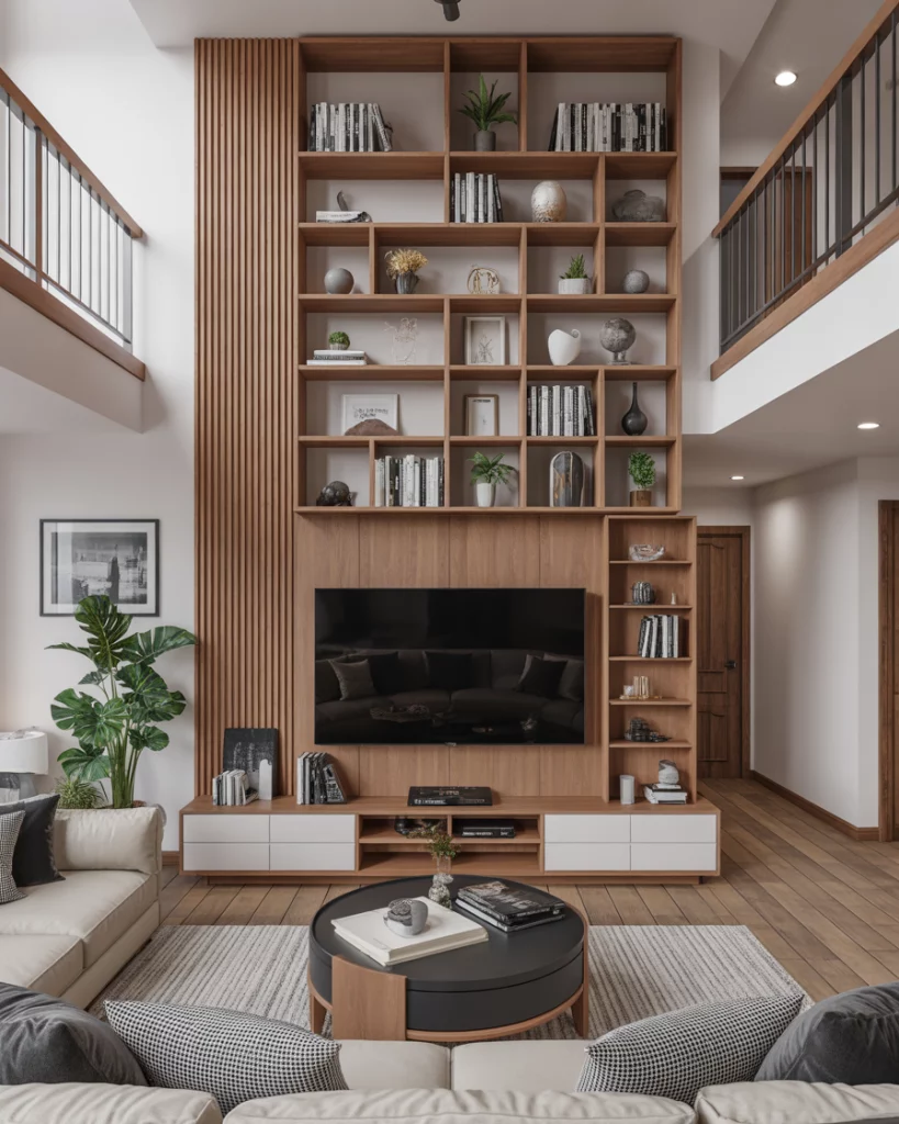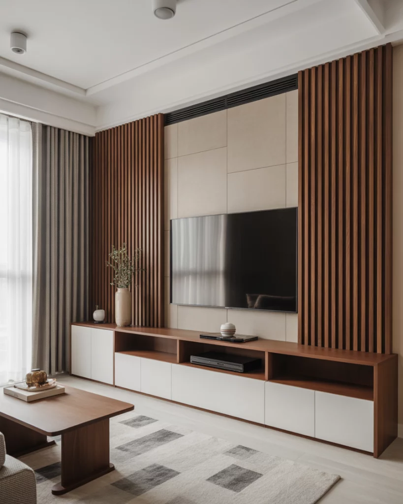 Wood slats are one of 2026’s favorite modern simple luxury features. Vertical slats behind the TV create rhythm and warmth, making the wall feel taller—great for rooms with a high ceiling or small space. The look works in small apartments home decor too, as thin wood strips don’t overwhelm but still add sophistication. Pair with a slim mount tv media console for a clean, elegant finish.
