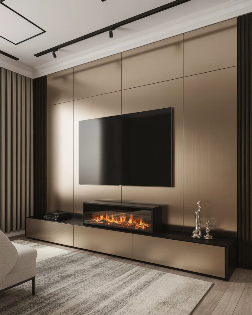 Gold, bronze, and brushed steel accents are defining modern luxury interiors in 2026. A metallic-finished TV wall adds glamour without needing bold décor. This style pairs well with fire places built ins or apartment with fireplace layouts, creating contrast between warmth and shine. With good lighting and sleek mount tv media consoles, metallics add instant sophistication to your living space.