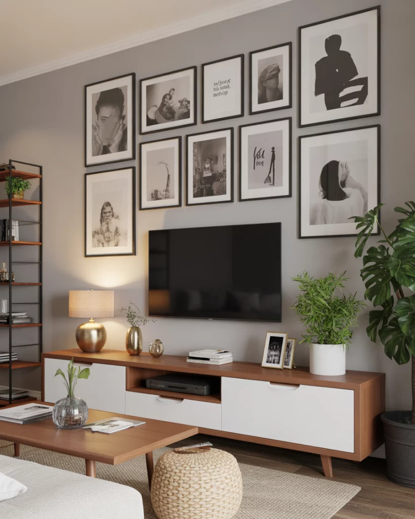 Why not treat your TV like a piece of art? Surround it with framed photos, artwork, or even digital screens in a gallery-style arrangement. This small apartments home decor trend balances the presence of the TV with personal touches, making the wall more inviting. It’s perfect for small space living, where every inch of wall matters, and diy customization makes it unique.