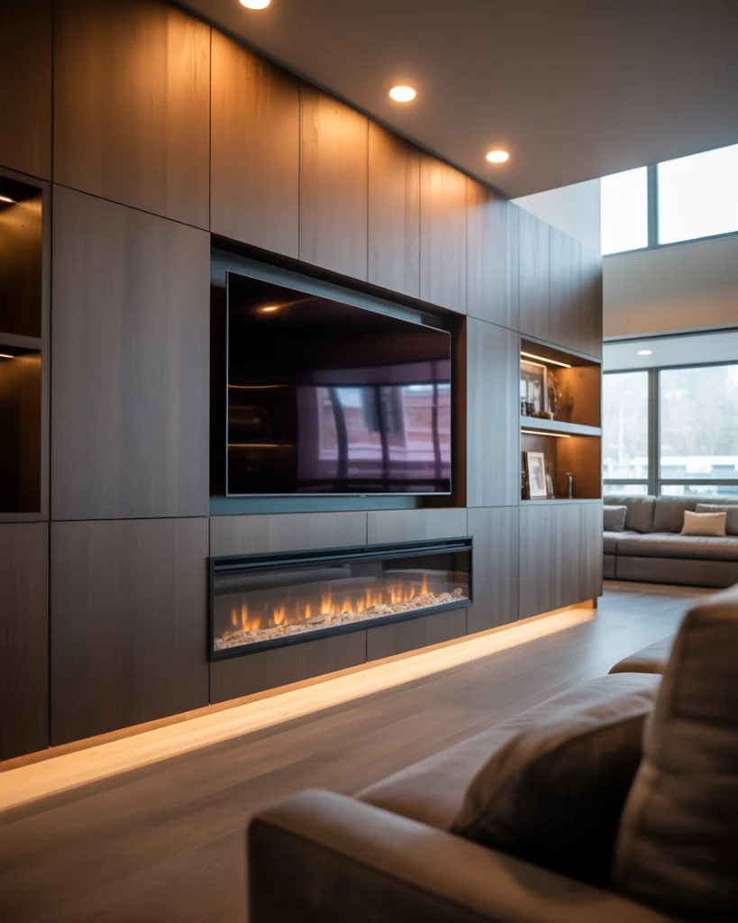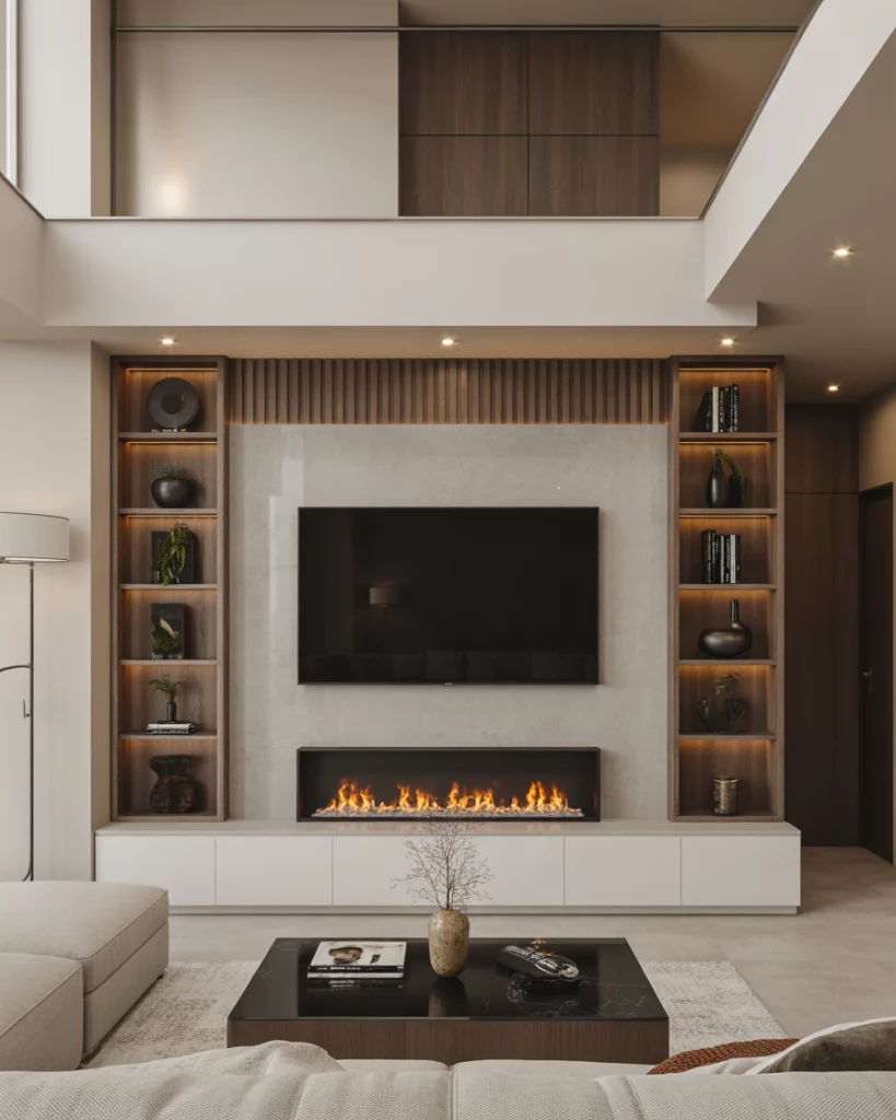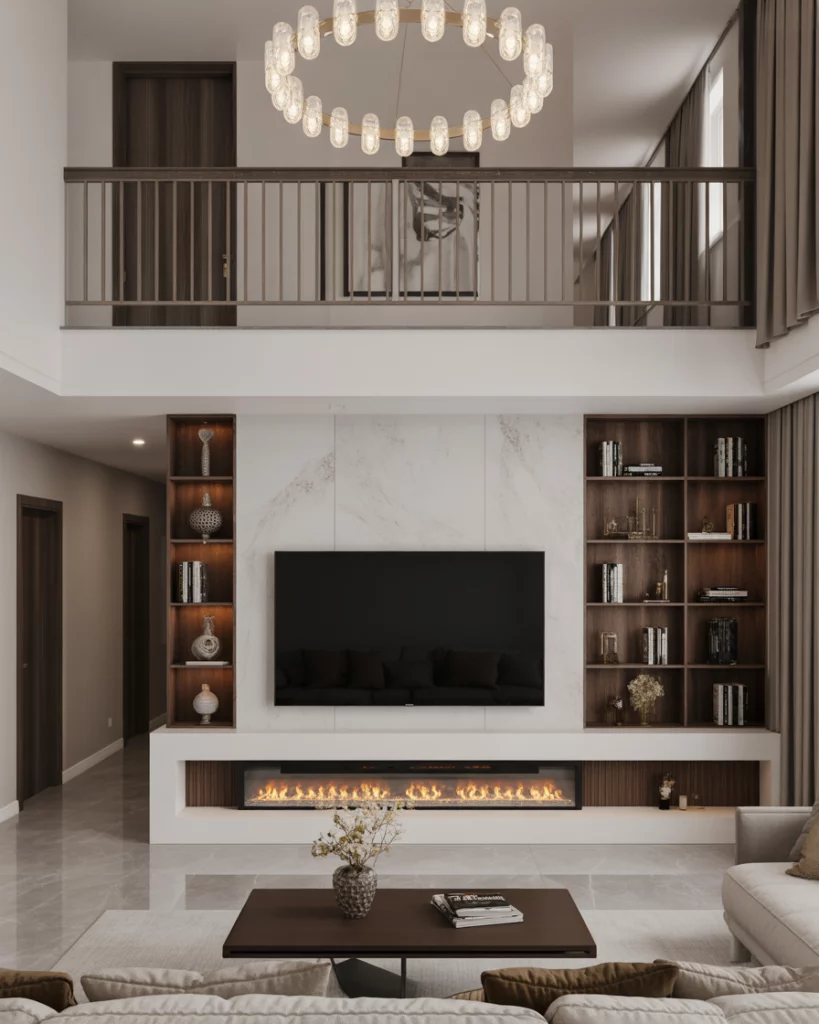 For those who love sophistication, modern luxury TV walls are all about seamless fire places built ins and sleek cabinetry. A mount tv interior design with hidden storage, recessed lighting, and integrated shelving can make even a 2 story living room feel like a designer showcase. Adding a fireplace beneath the TV brings warmth and elegance, turning your living room into a statement of modern simple luxury. This is a favorite for homes that balance tech with timeless appeal.
