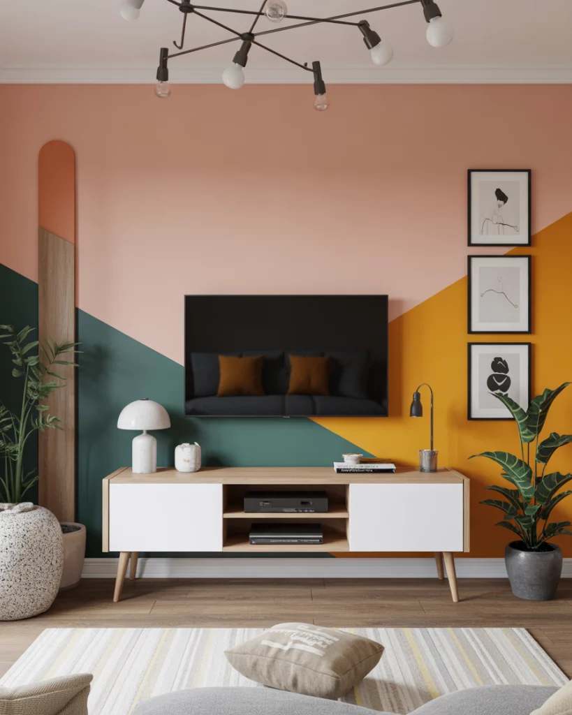 Color blocking on a TV wall brings energy and personality into small apartments interior design. By painting or paneling in bold contrasting shades, you can highlight the TV while adding visual interest to a small space. This diy-friendly approach works great for renters who want something unique yet easy to update. Pair with simple shelves or a compact small apartments entertainment center for balance.
