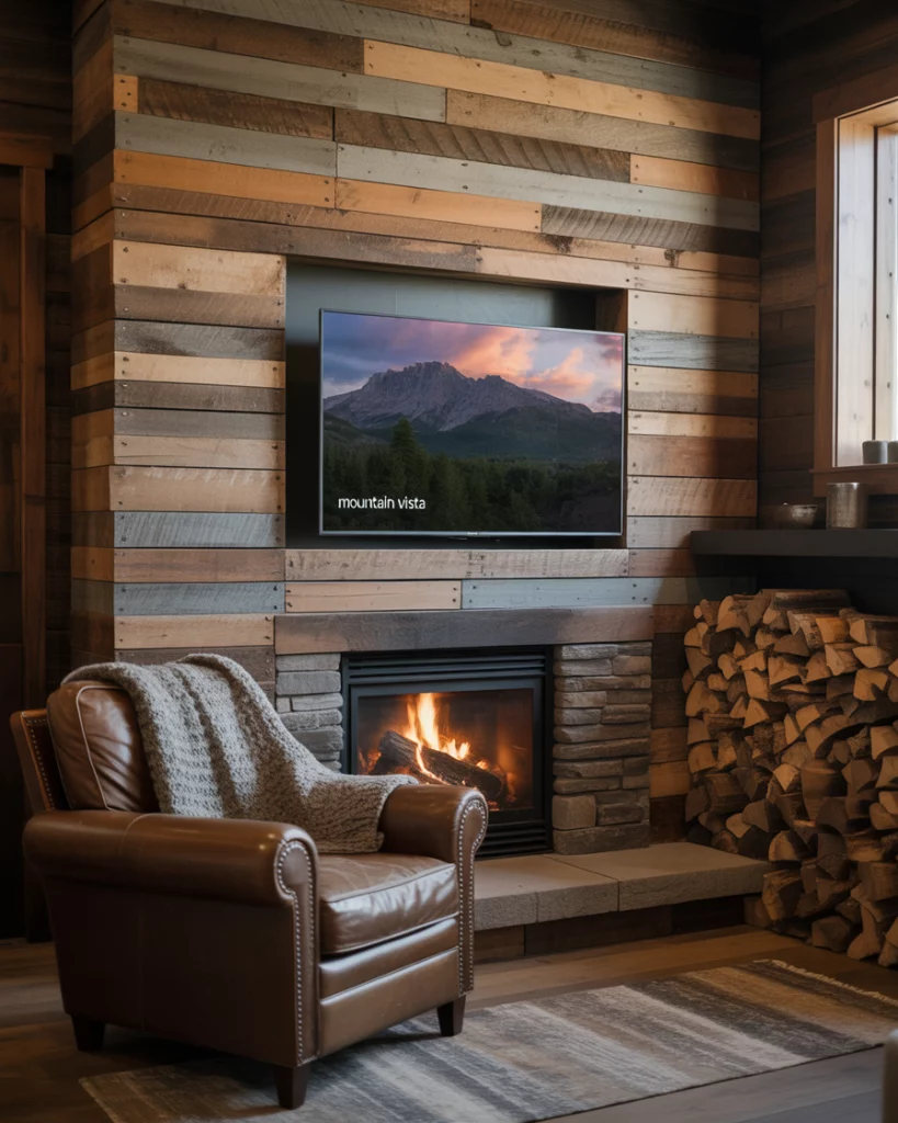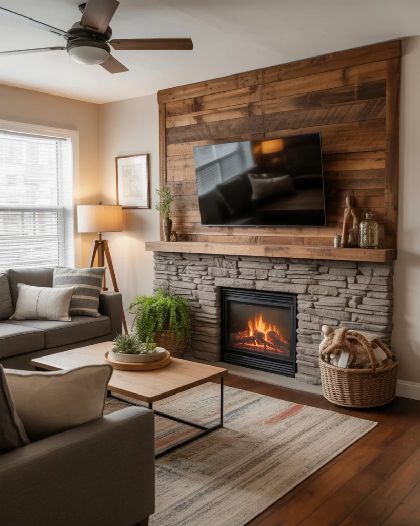 Not everyone wants ultra-modern; the rustic approach offers a cozier alternative. Imagine reclaimed wood beams, stone accents, and a central fire places diy fireplace beneath the TV. This design makes a small space feel welcoming while still practical. Often paired with warm colors and vintage textures, this style works in both suburban houses and apartment with fireplace setups. It’s a reminder that design can be both functional and nostalgic at once.