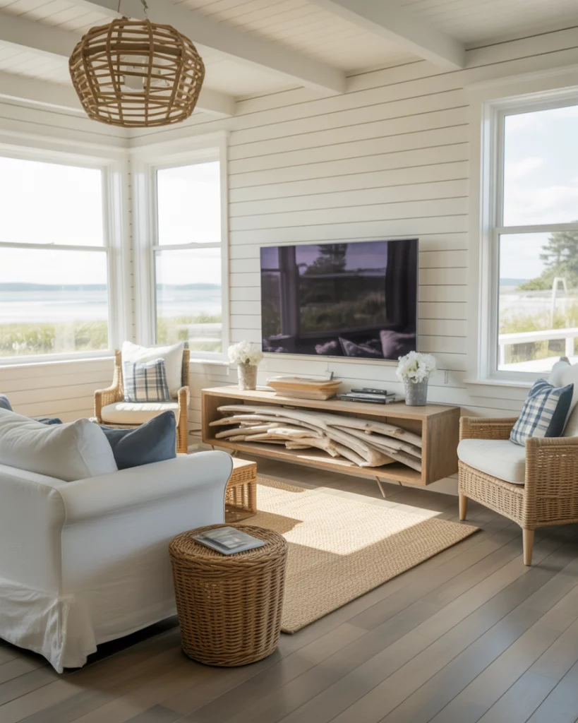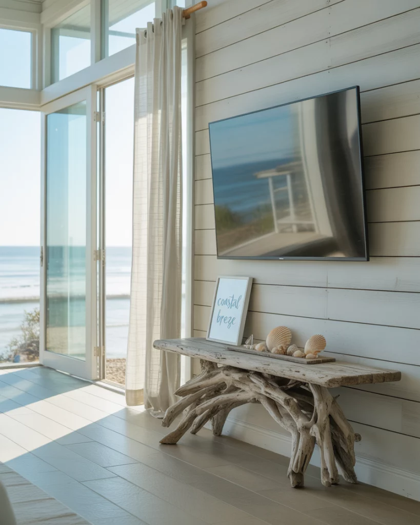 A coastal TV wall idea maximizes natural light and blends beautifully with windows framing the design. Think white shiplap walls, woven textures, and sea-inspired hues that make your living room feel airy and relaxed. In small apartments interior design, this style pairs well with a mount tv media console in white or driftwood finish, ensuring the wall doesn’t overwhelm. It’s a perfect choice for anyone dreaming of ocean calm even in the middle of the city.