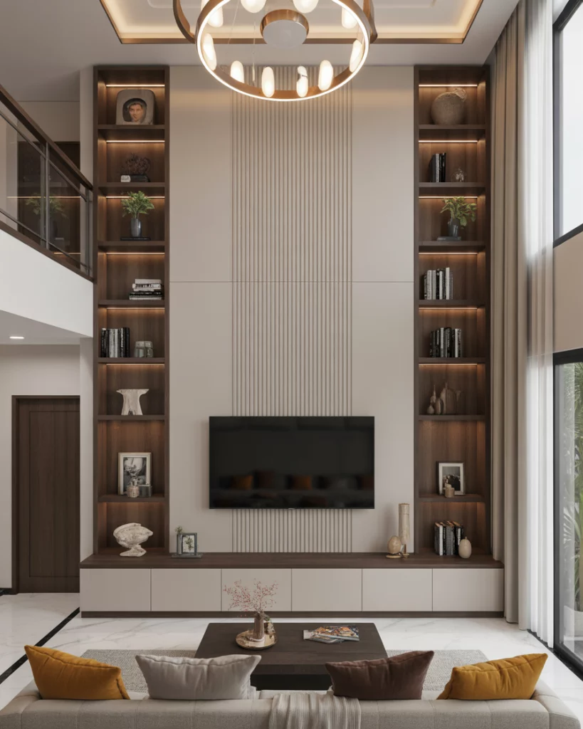 For a living room with a high ceiling, the TV wall becomes a vertical masterpiece. Designers in 2026 are leaning toward tall paneling, double-height shelving, and modern luxury finishes like marble or metallics. If you live in a 2 story home, this approach ensures your wall doesn’t feel empty but instead becomes a stunning feature. Balancing scale with elegance, a tall mount tv interior design can truly anchor the space.