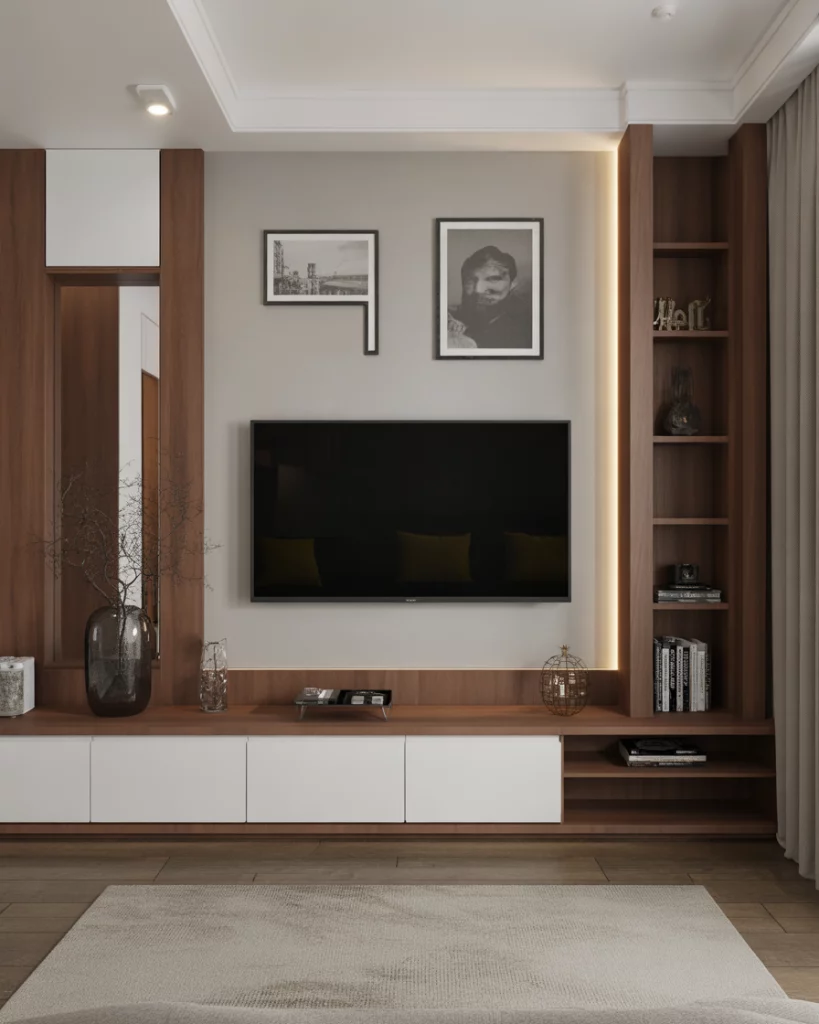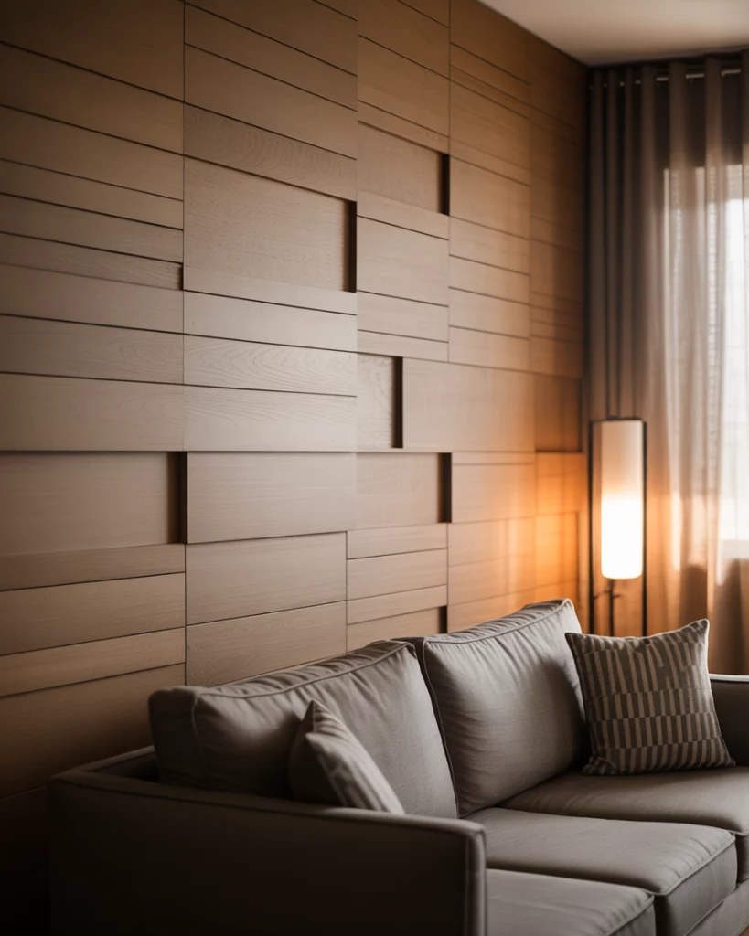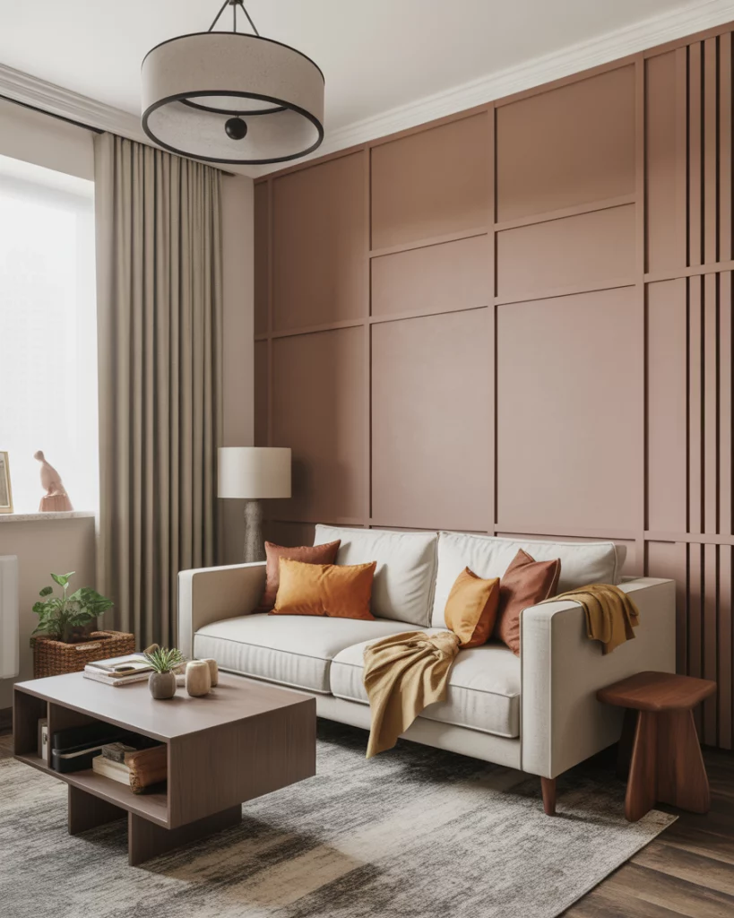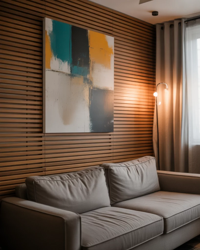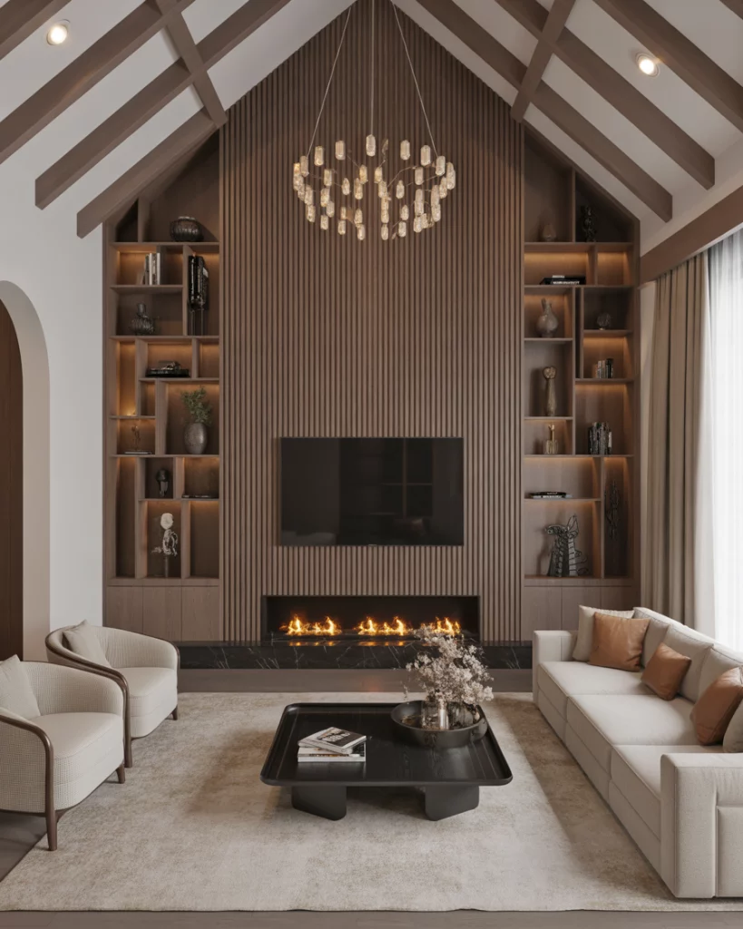 If your space has a vaulted ceiling or simply feels too empty, adding tall wood or fabric panels creates vertical emphasis. These ideas modern architectural designs bring balance and drama, especially behind a couch or around a TV setup. Neutral tones keep the panels subtle, while bold shades make them the centerpiece. This approach works equally well in ideas apartment layouts, making even small rooms appear larger.