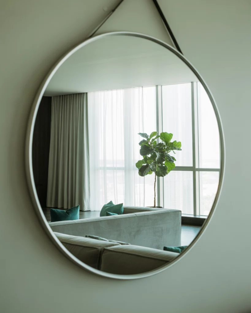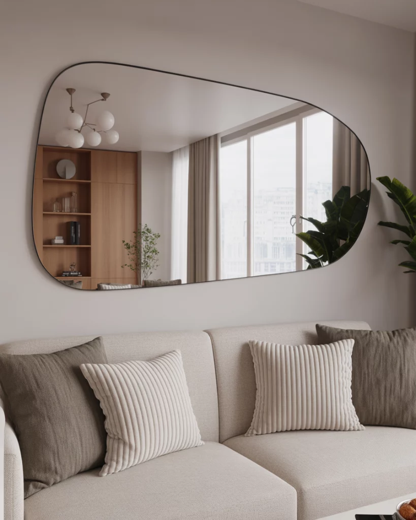 Adding a large mirror on the wall is one of the simplest yet most effective ideas modern decorators rely on. In 2026, oversized mirrors with rounded edges or rustic frames are trending, especially in smaller apartment living rooms. They not only reflect light to create a brighter, more cozy feel but also give the illusion of taller walls and a more expansive room. Perfect for positioning above couch or across from a window.