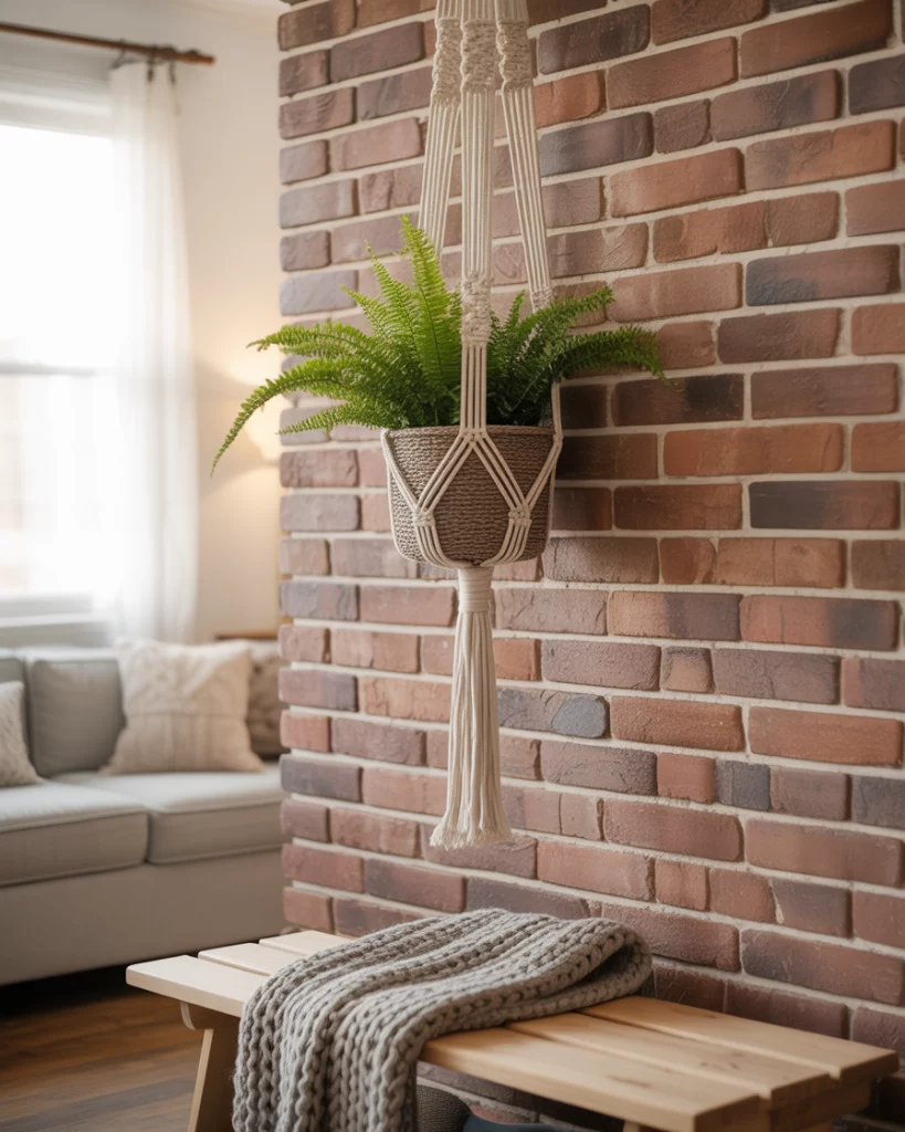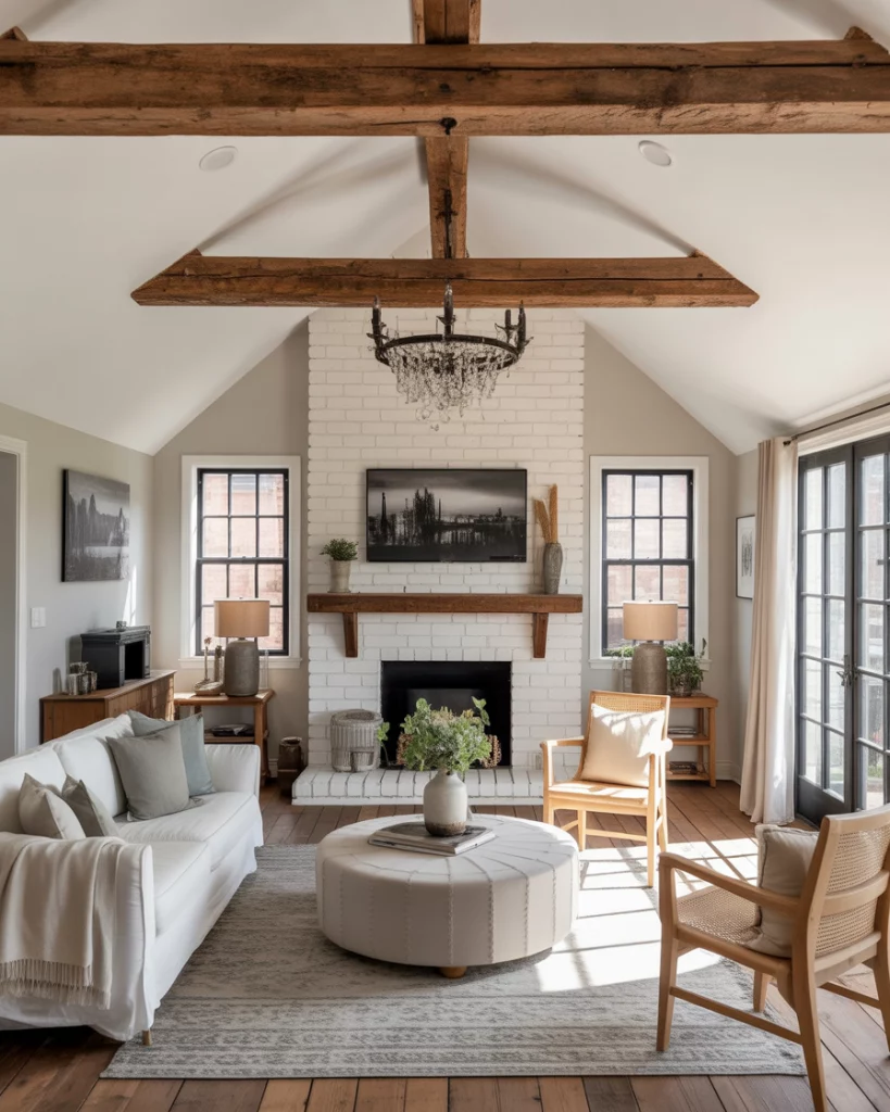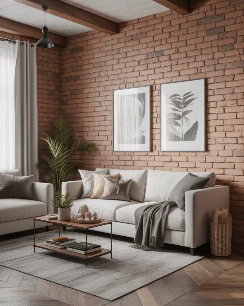 Nothing adds character like exposed rustic brick or stone. In 2026, this style is often paired with modern farmhouse furniture to create warm and cozy living rooms. Brick or stone walls work beautifully with vaulted ceiling homes, but peel-and-stick stone panels make it achievable in ideas apartment settings too. Many designers say this look tells a timeless story, bridging old-world charm with modern sensibilities.
