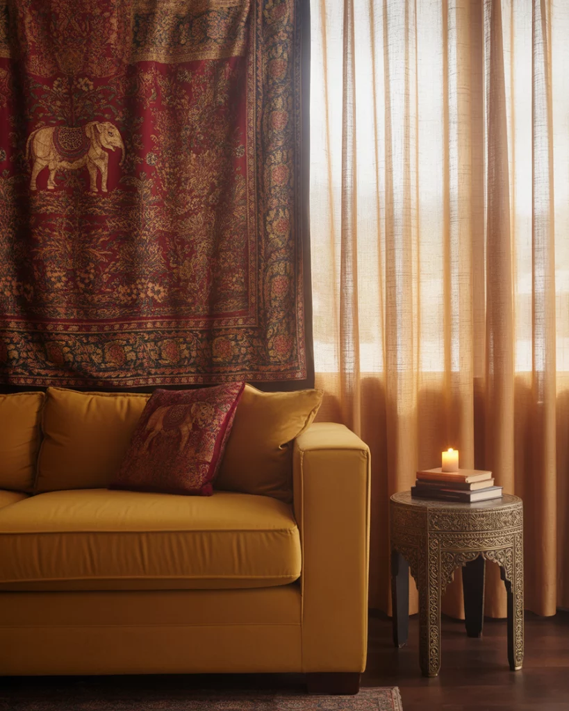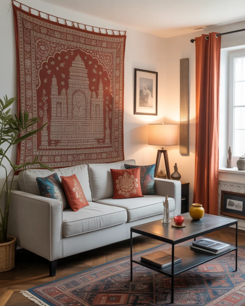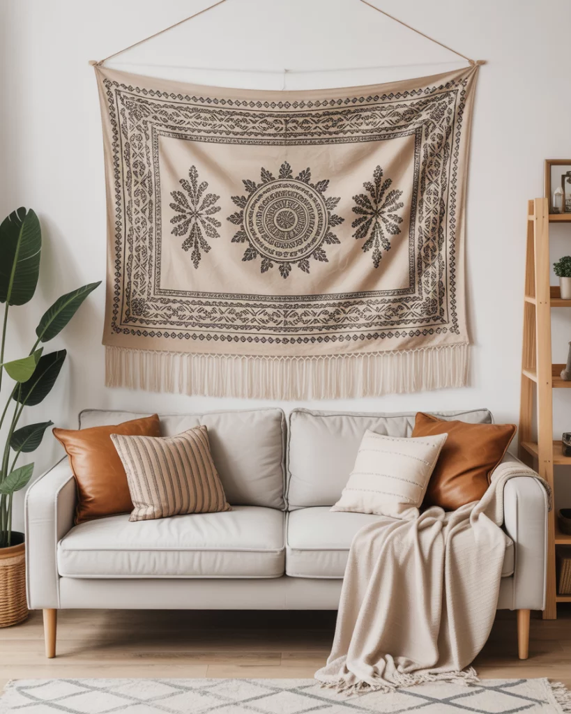 For a global twist, ideas Indian wall decor is gaining traction in 2026. Think vibrant tapestries, hand-carved wood panels, or block-printed textiles. These designs add warmth and character, ideal for cozy rooms or eclectic interiors. They look striking over couch spaces, turning the wall into a cultural statement. Many decorators suggest blending Indian textiles with neutral backdrops, so the colors stand out beautifully without overpowering.
