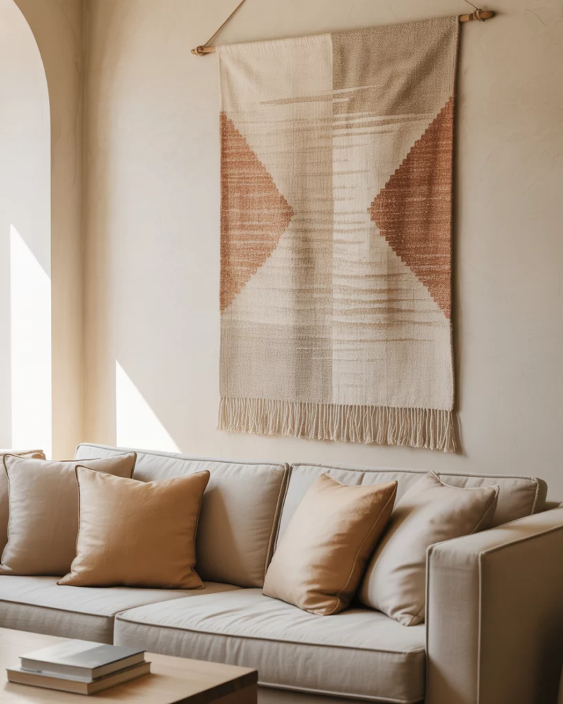 Soft textures like woven wall hangings or tapestries bring a cozy element to living rooms in 2026. Designers often suggest fabric panels in neutral or earthy colors for ideas modern or boho-inspired interiors. Hung over couch, they double as art and sound absorbers, making them especially great for apartment living. Handcrafted textiles also bring in artisan charm and add a tactile story to the decor.