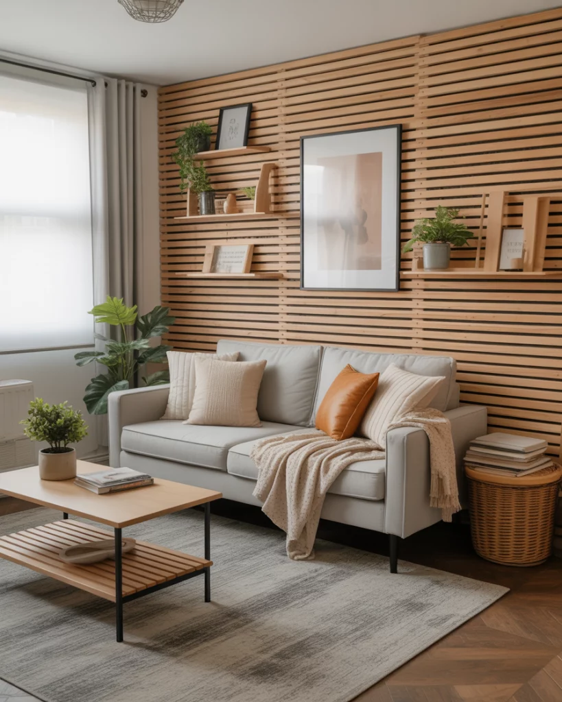 The DIY trend of slat wood walls keeps growing in 2026, especially in ideas apartment living rooms. These thin vertical panels create rhythm and texture while staying sleek and modern. Slat walls are often used above couch or behind TVs, doubling as a design statement and sound buffer. Their versatility makes them ideal for combining with neutral or rustic palettes, depending on personal preference.