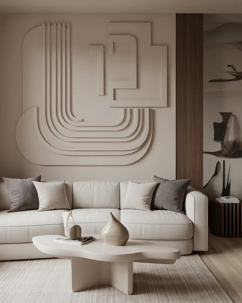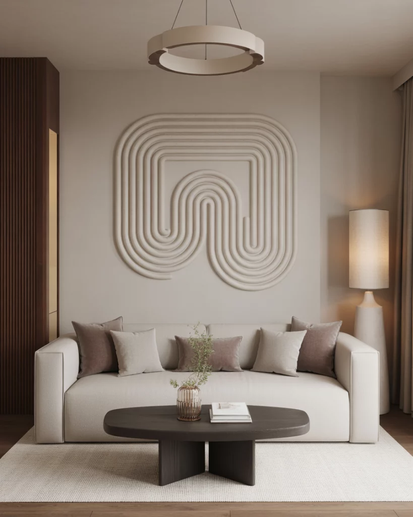 Lastly, layering neutral shades—beige, ivory, gray—with sculptural wall accents creates a modern luxury effect. Think ceramic discs, metal sculptures, or woven designs placed above couch to create depth. These elements feel elegant without overwhelming the eye, perfect for ideas apartment living rooms or larger homes with vaulted ceiling walls. It’s a subtle yet impactful way to tell your wall’s story.