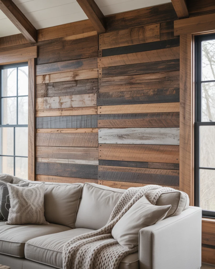 Repurposed beams are gaining traction in 2026 as unique wall decor. Mounted horizontally or vertically, these rustic pieces add warmth and texture to modern farmhouse or industrial designs. They’re especially dramatic in homes with a vaulted ceiling, where their natural patina draws the eye upward. Even in an apartment, a smaller beam over couch can create a grounded, cozy focal point without needing additional art.