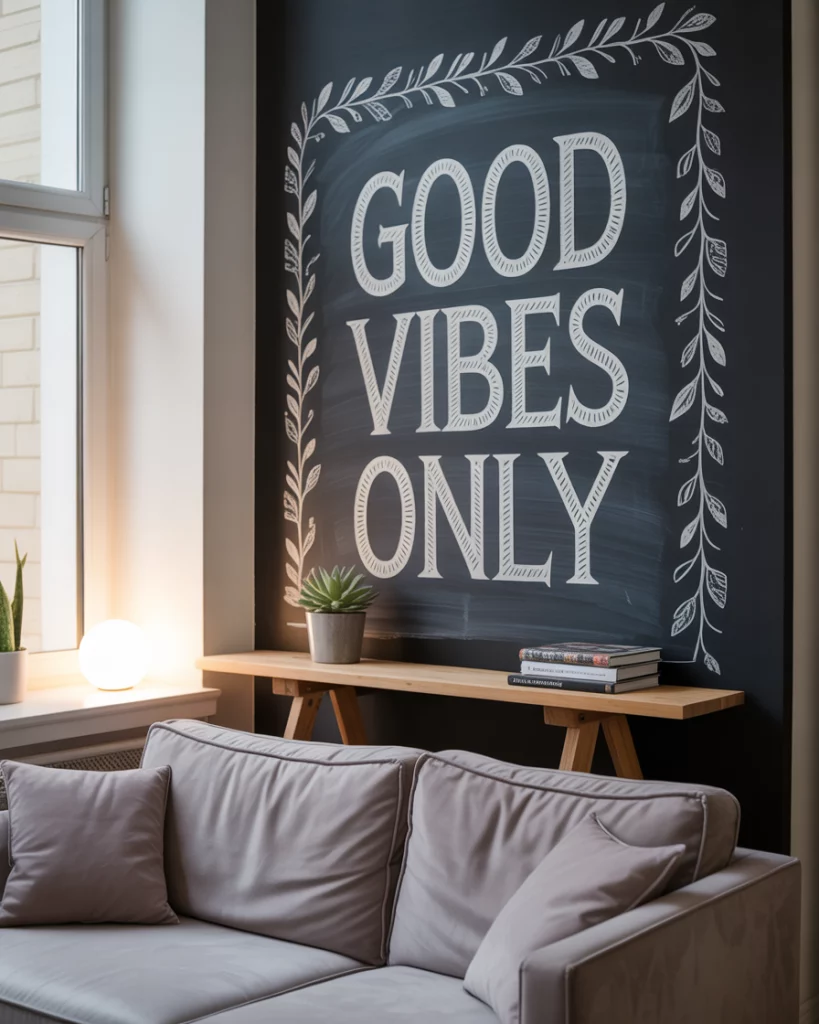 Interactive walls are making waves in 2026, especially in family homes and ideas apartment living. A DIY chalkboard or writable wall paint adds both fun and functionality. Positioned above couch or near a TV, it becomes a space for sketches, notes, or rotating ideas pictures drawn by hand. This design encourages creativity while blending seamlessly with ideas modern luxury or casual eclectic styles. It’s also an affordable way to personalize a living room’s story.