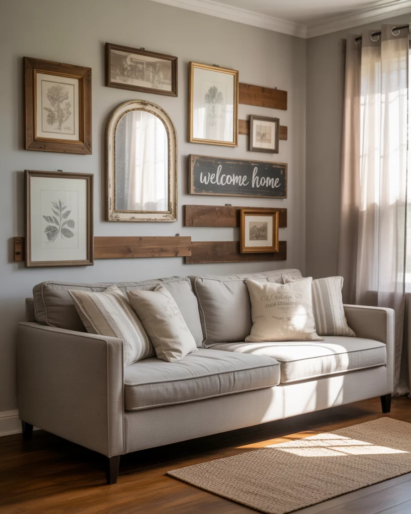 For those who love rustic texture, blending reclaimed wood with modern farmhouse simplicity remains a leading look in 2026. Think ideas above couch modern farmhouse: a reclaimed barn beam shelf styled with lanterns, layered frames, or greenery. This mix feels both timeless and trendy, ideal for anyone who wants warmth without clutter. It also works in homes with a vaulted ceiling, where rustic accents ground the space and highlight architectural height.