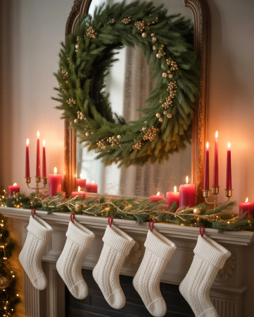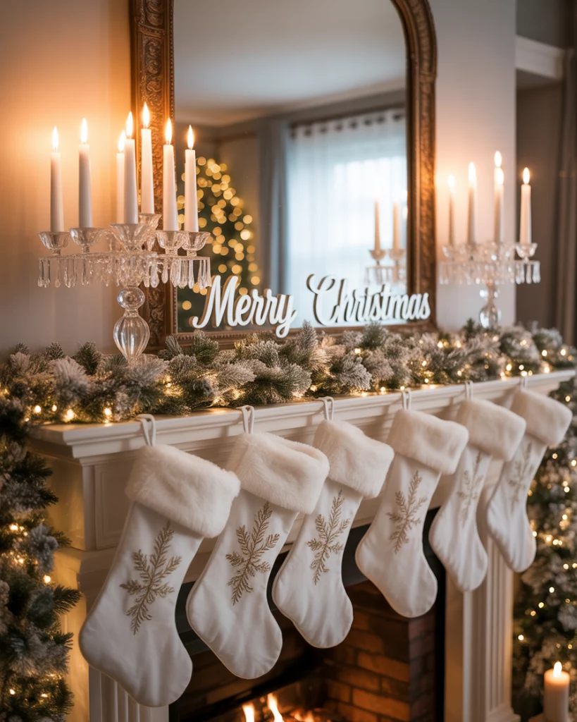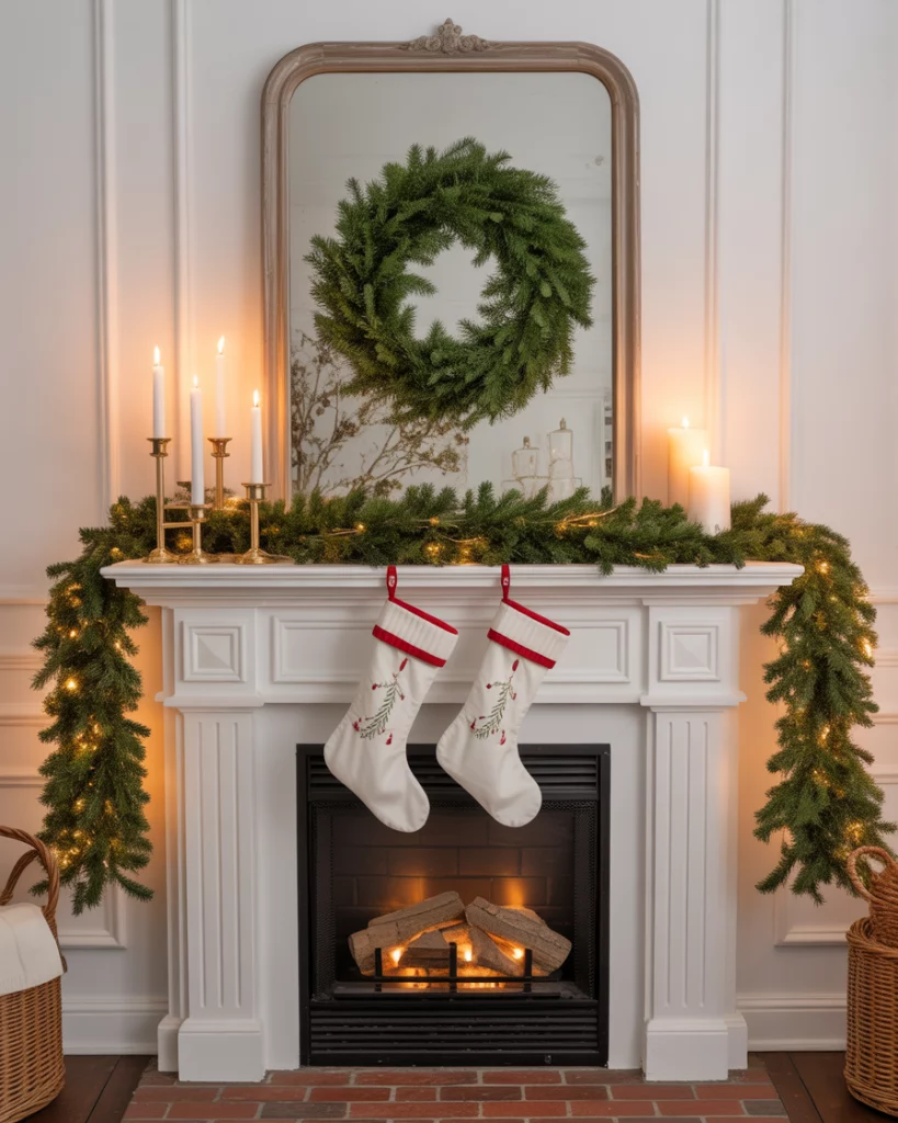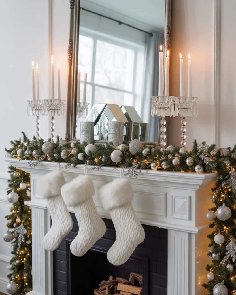 For a touch of sophistication, try an elegant christmas mantle paired with mirror above. Use silver garlands, crystal candlesticks, and white stockings to create refined symmetry. Adding subtle lights that reflect in the fireplace mirror makes the space sparkle without being too flashy. This look works well in corner fireplaces where elegance softens the space. Guests often say it feels like a holiday setup straight out of a classic movie.