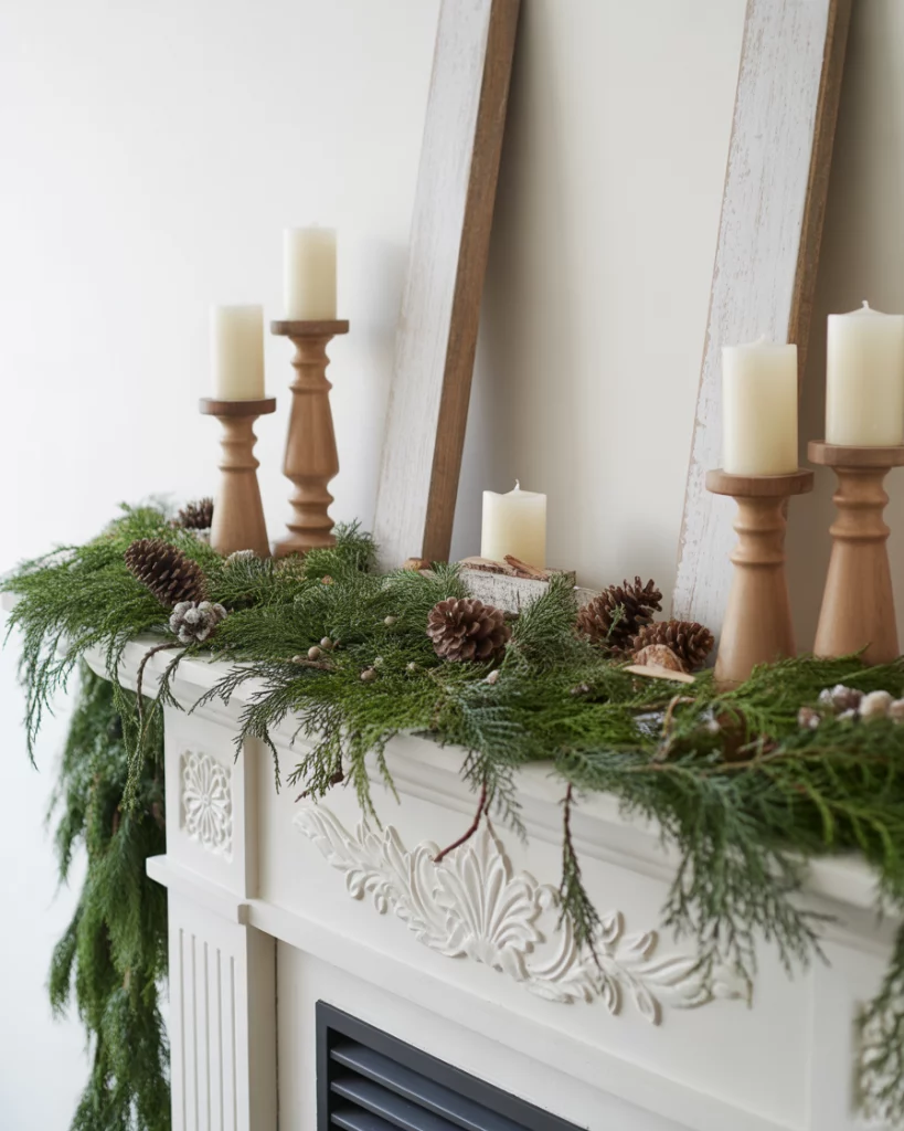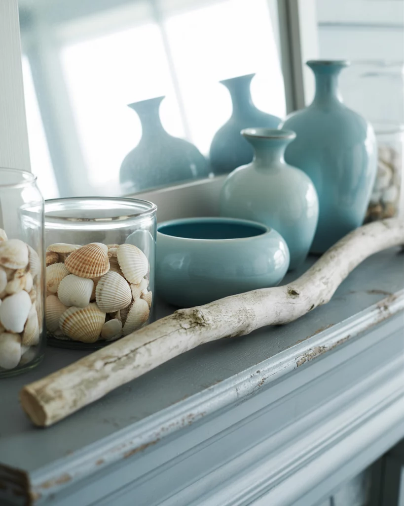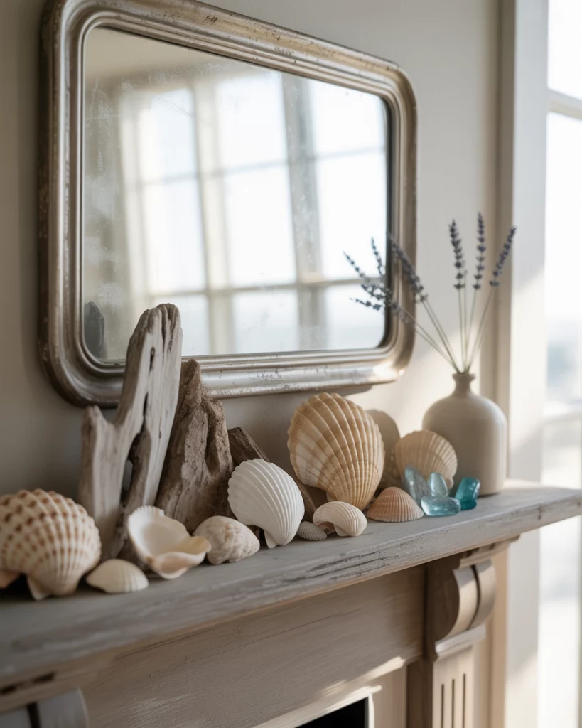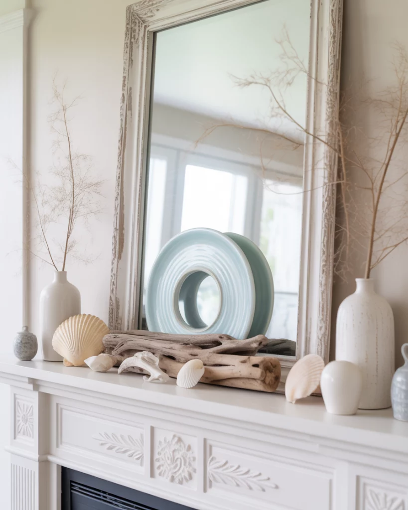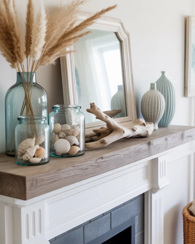 For homes near water—or those who wish they were—a coastal mantle makes the room feel breezy all year. Pair driftwood with light blue ceramics, add seashells in glass jars, and keep tones airy. It’s an excellent everyday design choice, adaptable for holidays with a few swaps. For example, you can style it into a neutral christmas by adding white candles and frosted greenery. It works seamlessly in corner mantles too.