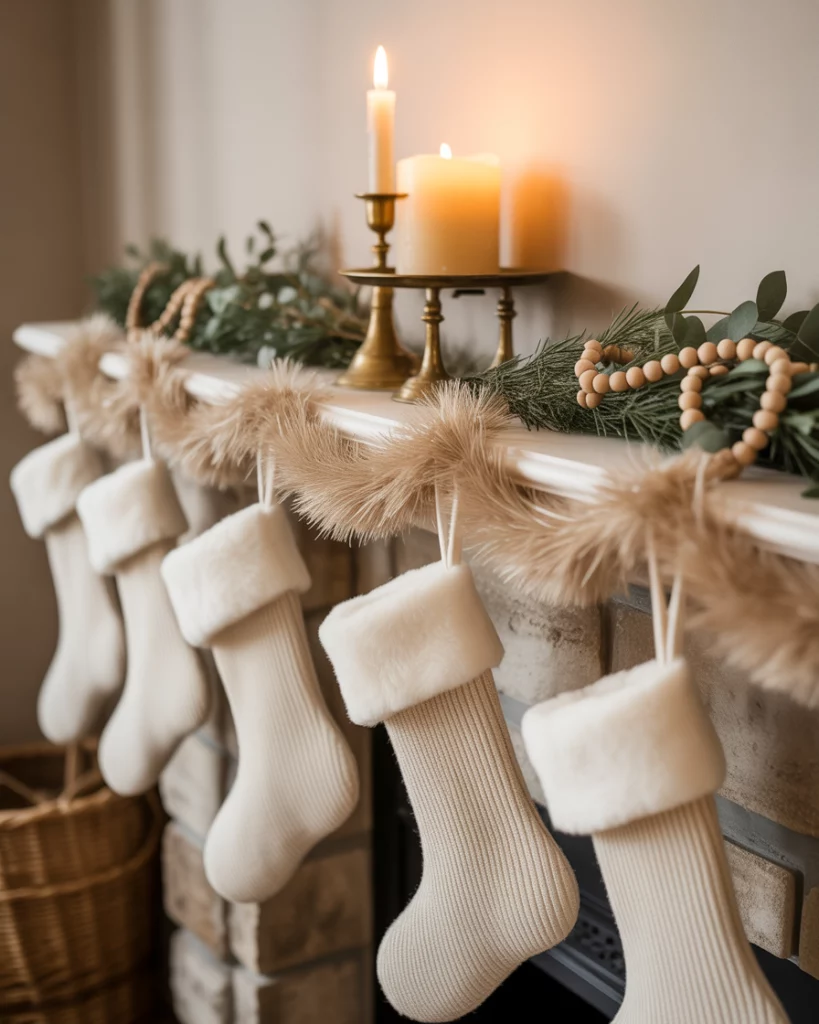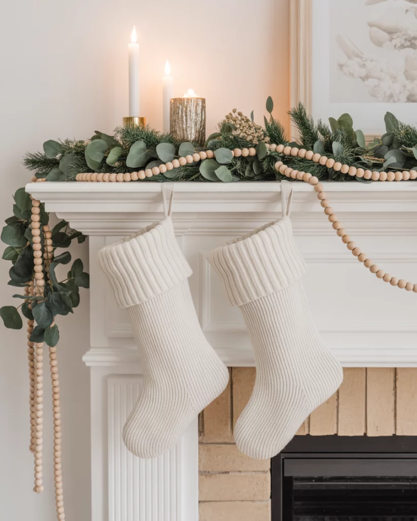For lovers of calm spaces, a neutral christmas mantle offers peace during the busy holiday season. Think ivory stockings, beige garlands, and wooden bead chains hanging over the fireplace. Add dried oranges or eucalyptus for a natural touch. This style is a perfect match with tv above, since it keeps visual noise low. I once saw a neighbor’s mantle styled this way, and it looked both festive and restful—a retreat from the chaos of shopping and parties.