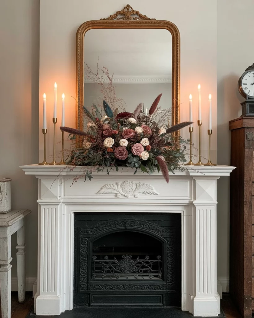 Sometimes bigger is better, and a large mantle arrangement can make a space feel grand. Oversized mirrors, tall candlesticks, and dramatic florals work well with mirror or even with clock above. This approach fits well in open living spaces or homes with vaulted ceilings, where scale matters. Adding height ensures balance with larger fireplace structures. Guests are often wowed by the boldness—it becomes the showpiece of the whole room.