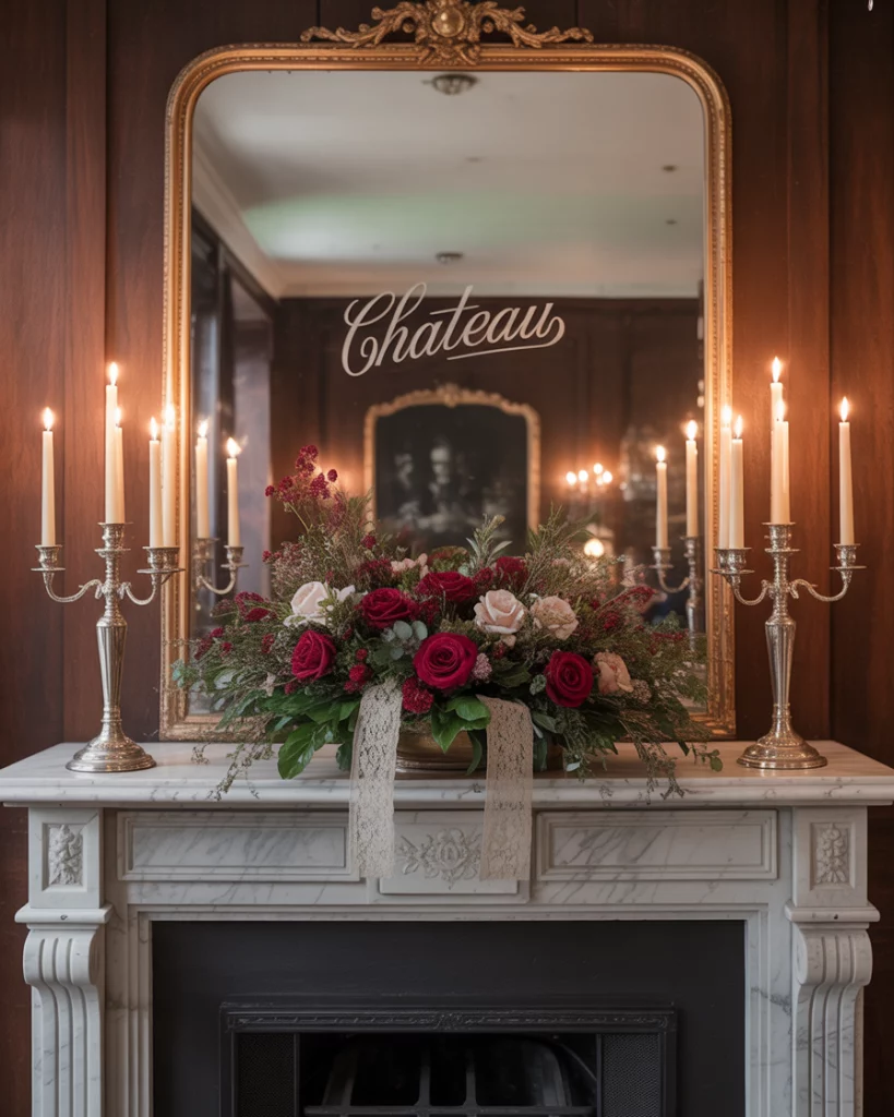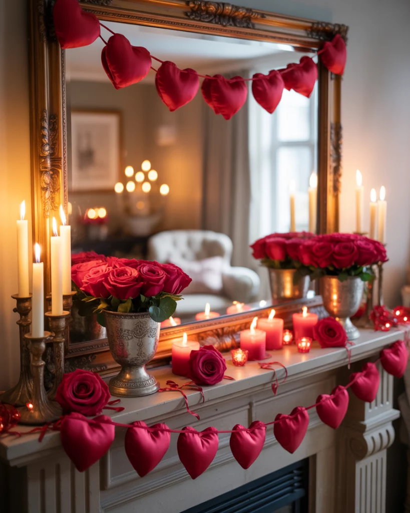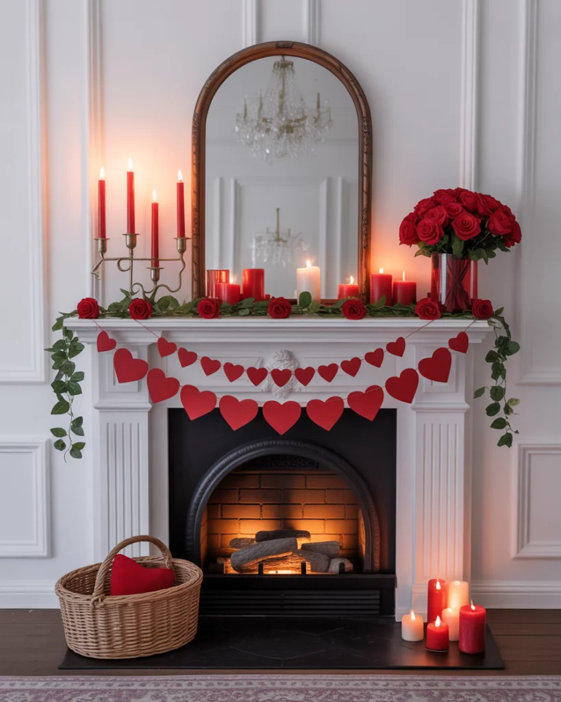 A mantle styled for Valentine season feels inviting and playful. Roses in glass vases, heart-shaped garlands, and a few bold accents in red or blush create the theme. Place layered candles over a fireplace mirror for glowing warmth. This look works in both contemporary and traditional spaces. I once saw a couple decorate with handwritten love notes tucked into the garland—a personal, inexpensive touch that adds real meaning. It’s festive, romantic, and charming.