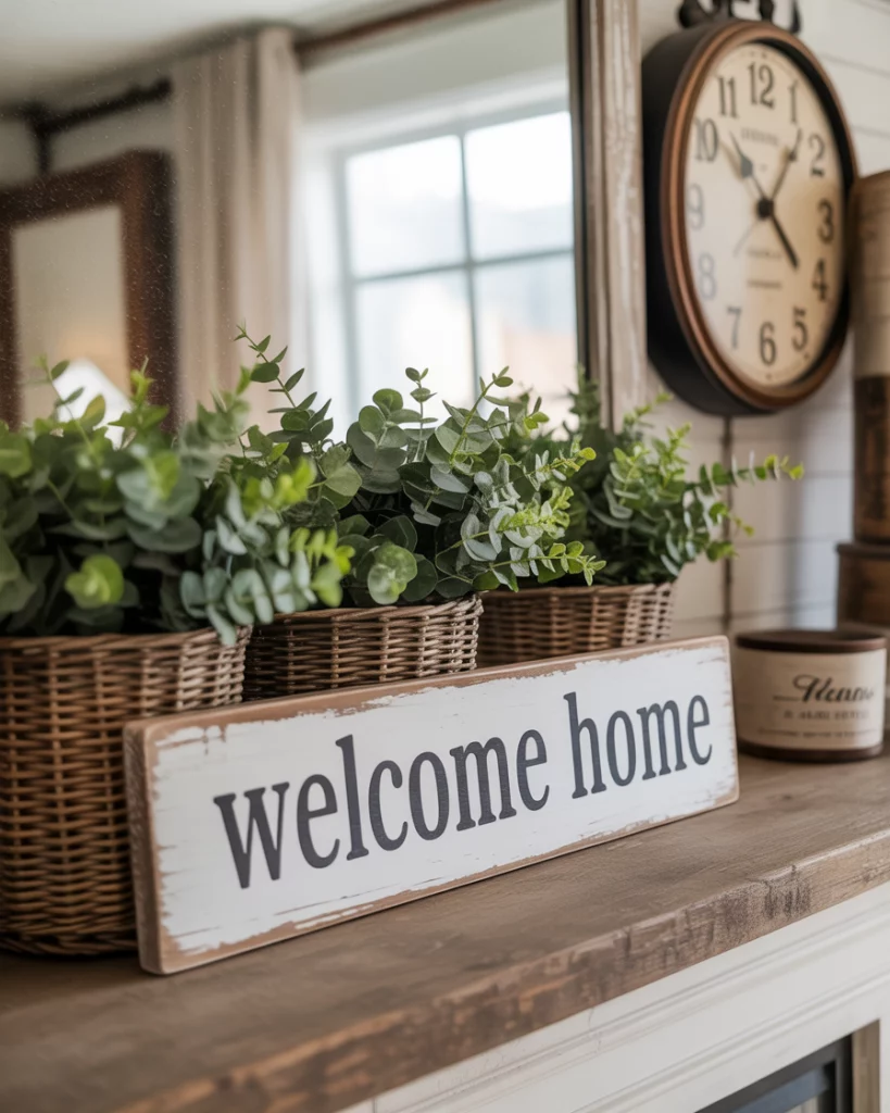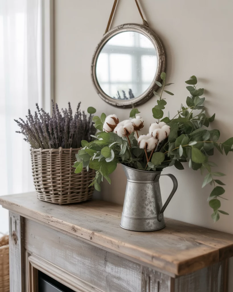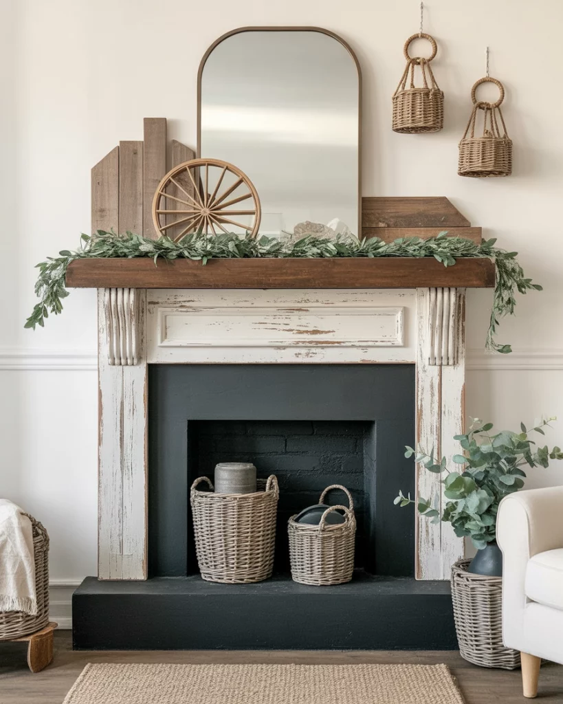 Blending everyday living with farmhouse character, this mantle style mixes practicality and charm. Distressed wood, woven baskets, and simple greenery create an approachable vibe. It’s perfect for homes where mantles need to work everyday simple, not just during holidays. Add a small fireplace mirror or family photos over the mantle for personality. It’s the kind of look that makes you feel instantly at home, no matter the season.