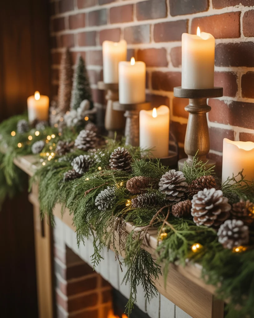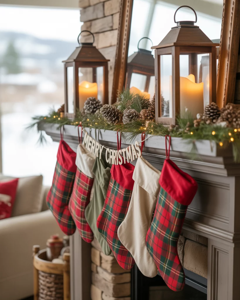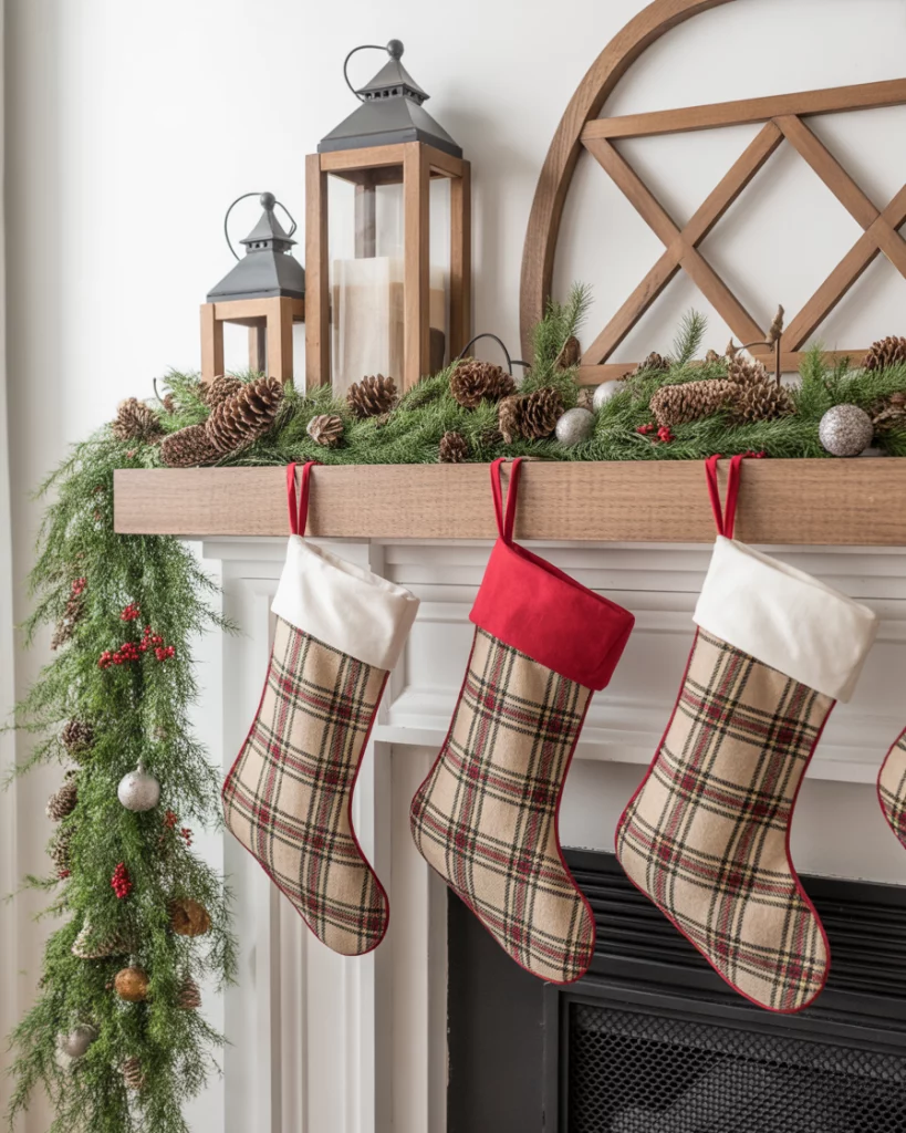 For those who lean toward the farmhouse aesthetic, a rustic christmas mantle creates warmth with natural textures. Picture wood lanterns, plaid stockings, and pinecones, accented with raw wood candlesticks. Adding greenery feels authentic, while woven baskets below make the space cozy and practical. This style pairs effortlessly with tv or even with mirror above—it’s understated but heartfelt. Friends will feel at home instantly, and it works great for christmas gatherings where comfort matters more than glamour.