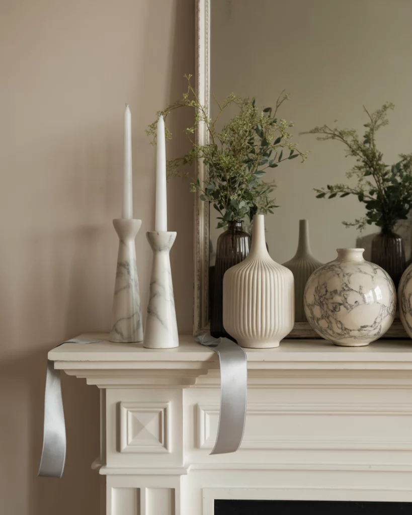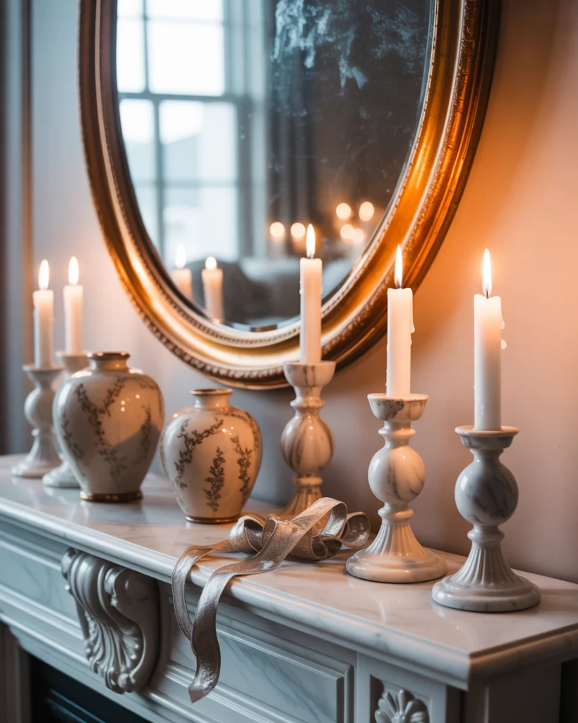 The white mantle aesthetic is timeless, exuding crisp elegance. Layer white vases, marble candlesticks, and ceramic accents with mirror or with clock above. This works year-round but shines in transitional seasons like spring or fall. I once styled a mantle like this for a friend’s elegant christmas, adding silver ribbons to the all-white look, and it was unforgettable. Simplicity becomes the ultimate sophistication.