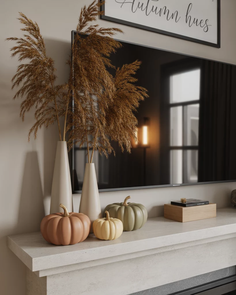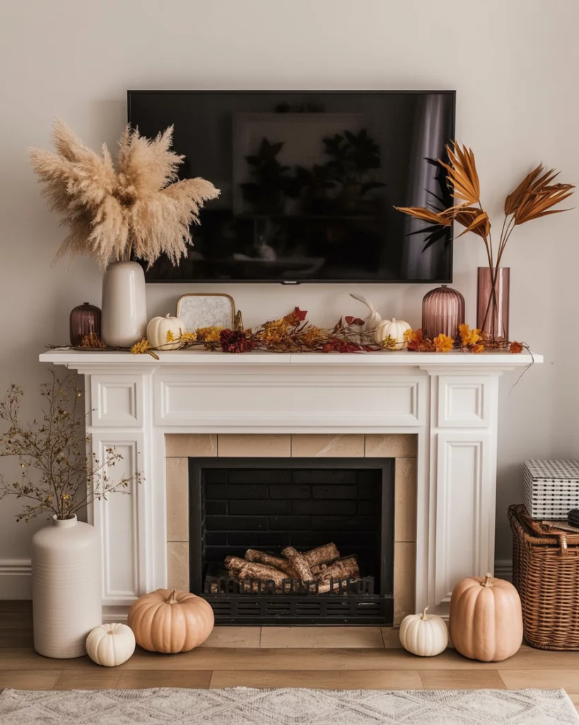If you want seasonal style with tv above, the modern fall mantle is perfect. Low-profile pumpkins, dried pampas grass, and slim vases create a chic balance without blocking the screen. Add muted orange and deep brown accents over the fireplace for warmth. Many city apartments adopt this approach, making the mantle festive without overwhelming a smaller living space. It’s modern, stylish, and TV-friendly.