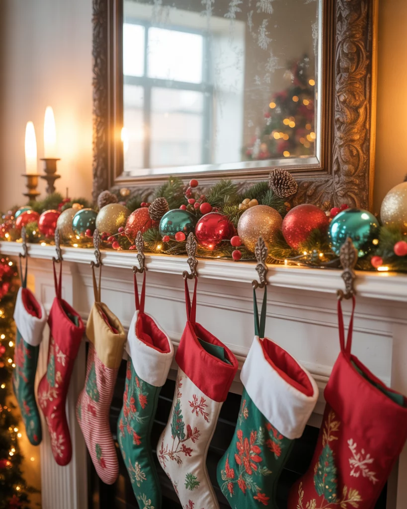 If you’re tired of neutrals, a colorful christmas mantle bursts with energy. Bright ornaments, multi-colored stockings, and playful garlands create a cheerful atmosphere. This style is great for families with kids—it’s fun, lively, and doesn’t take itself too seriously. Add layered lights with mirror above the fireplace to reflect the brightness. It feels nostalgic, like a throwback to holiday mornings full of excitement.